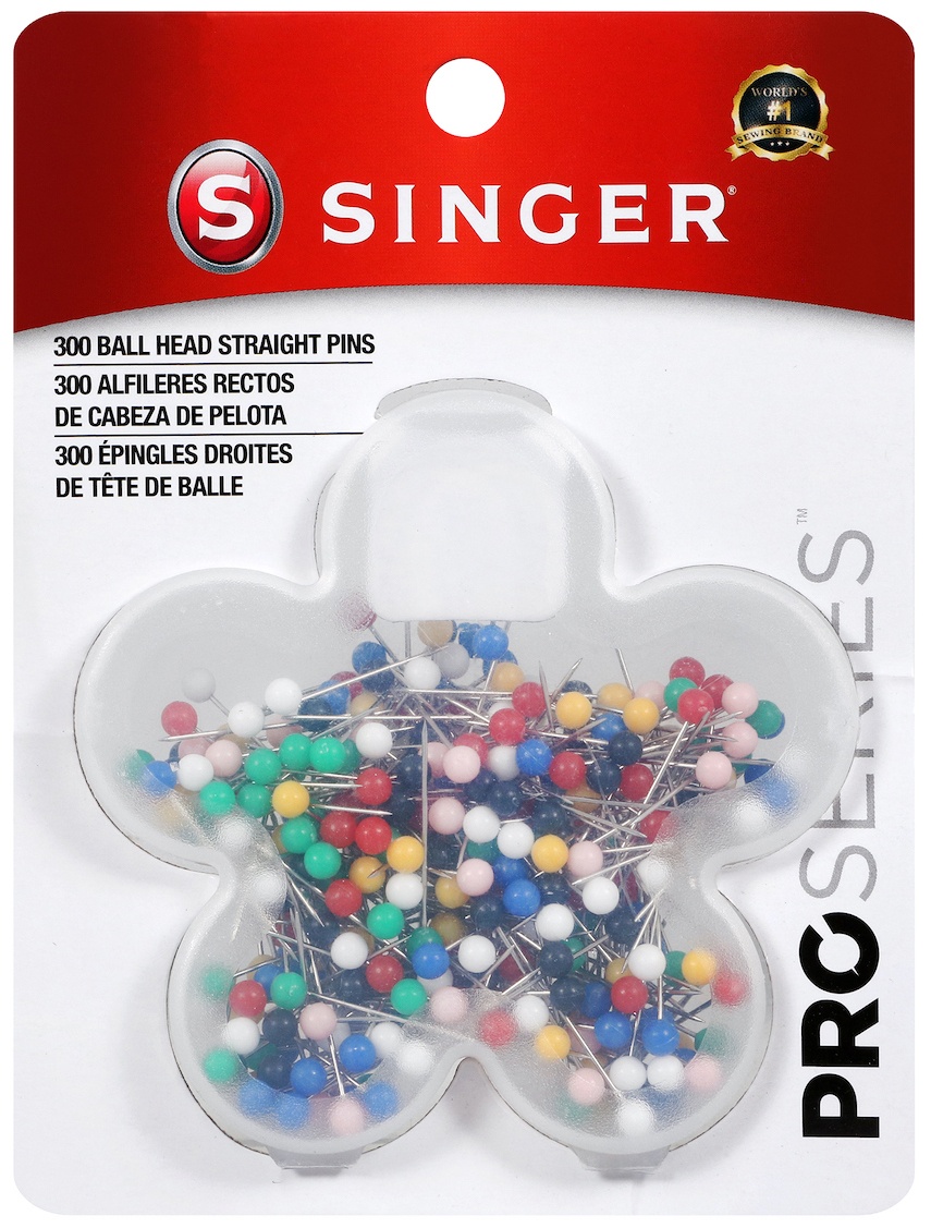 SINGER-QuiltPro Ball Head Straight Pins. These nickel plated steel pins are perfect for all your sewing needs. This package contains 300 pins in a plastic flower-shaped container. Pin size: 17 1-1/16 inches. Imported.