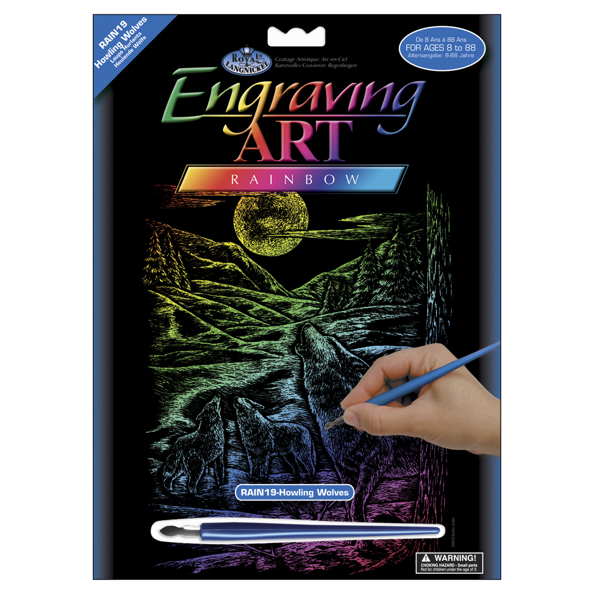 ROYAL LANGNICKEL-Engraving Art. Easy to use Engraving Art allows you to create fantastic foil artwork. You simply scrape the lines that are pre-printed on the board with the provided tool. This package contains one 10x8in pre-printed board, a practice board and scraping tool. Available in Silver, Gold, Copper, holographic, rainbow and more: each sold separately. Recommended for children ages 8 and up. WARNING: Functional Sharp Object. Not for children under 3 years. Imported.