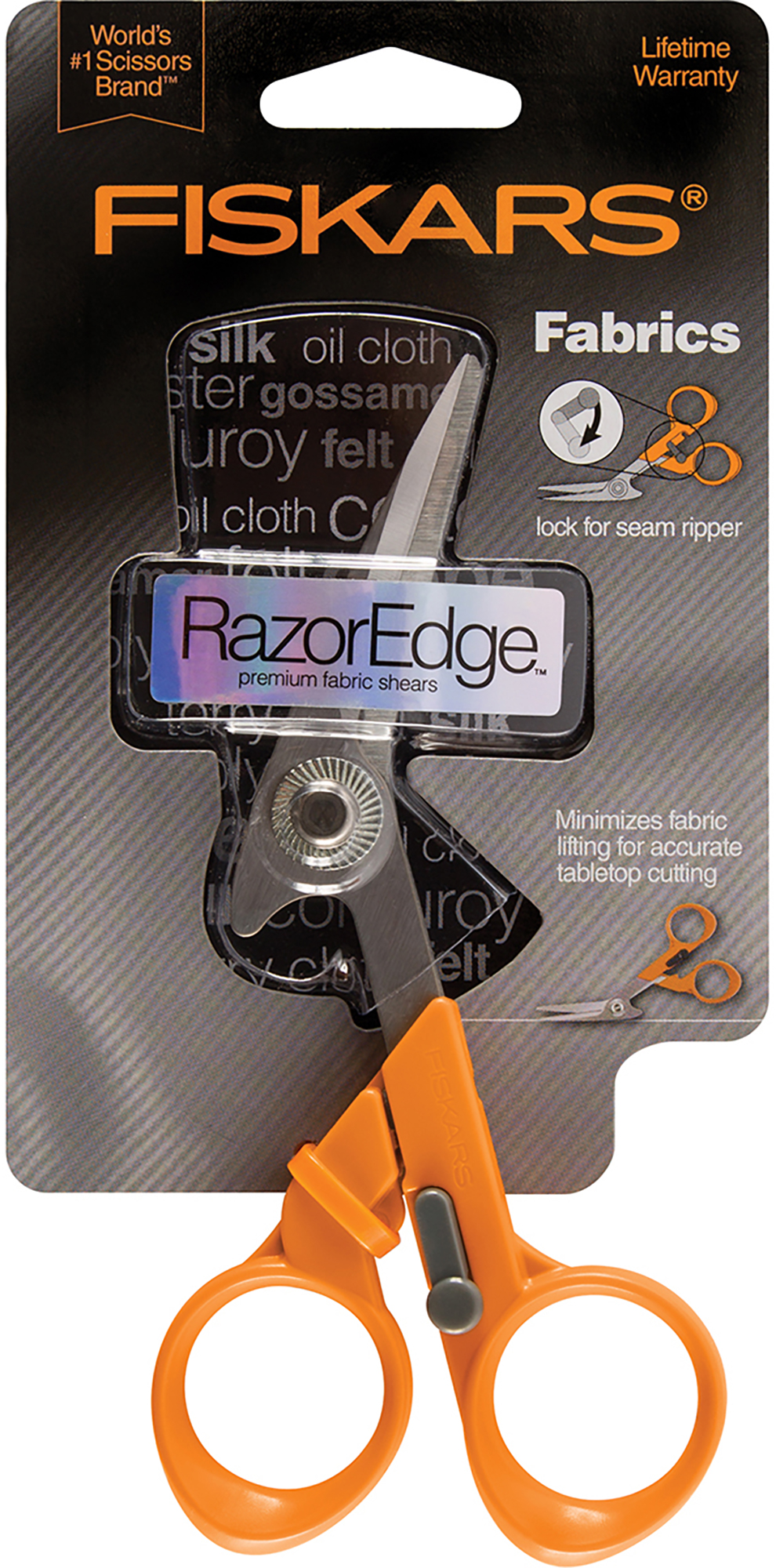 Fiskars-RazorEdge Tabletop Fabric Shears. Premium fabric shears feature ultra-sharp blades and unique offset handle design for accurate tabletop cutting. Ideal for cutting in tight spaces and detail work. Sliding lever locks blades into position for seam ripping. This package contains one pair of 5 inch RazorEdge tabletop fabric shears. Imported.