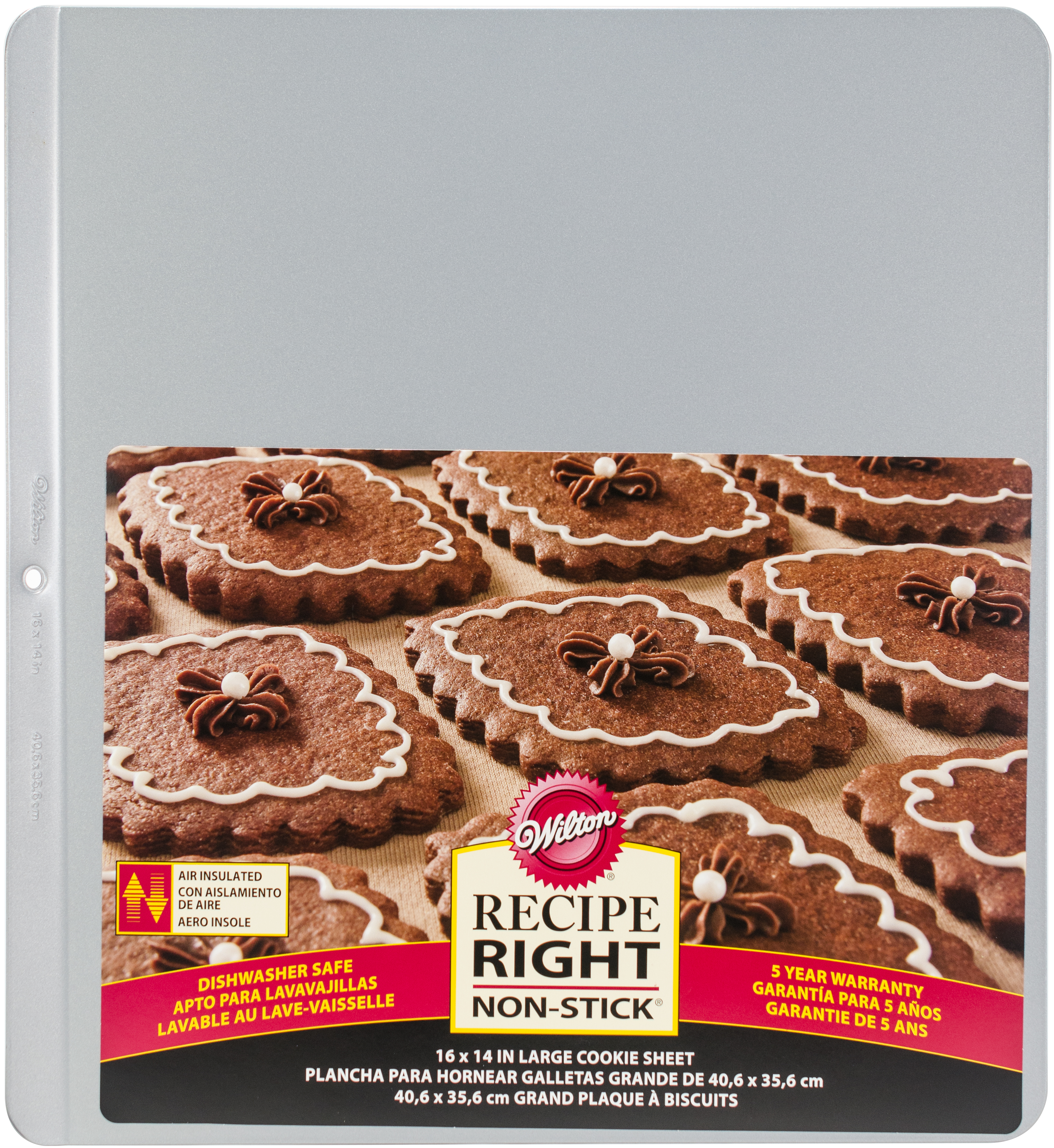 WILTON-Recipe Right Non-stick Cookie Sheet. Recipe Right products are constructed of heavy-gauge aluminum that spreads heat evenly and prevents warping. The reinforced non-stick surface provides quick release and easy clean-up. This package contains one 16x14 inch large cookie sheet. Hand wash. Imported.