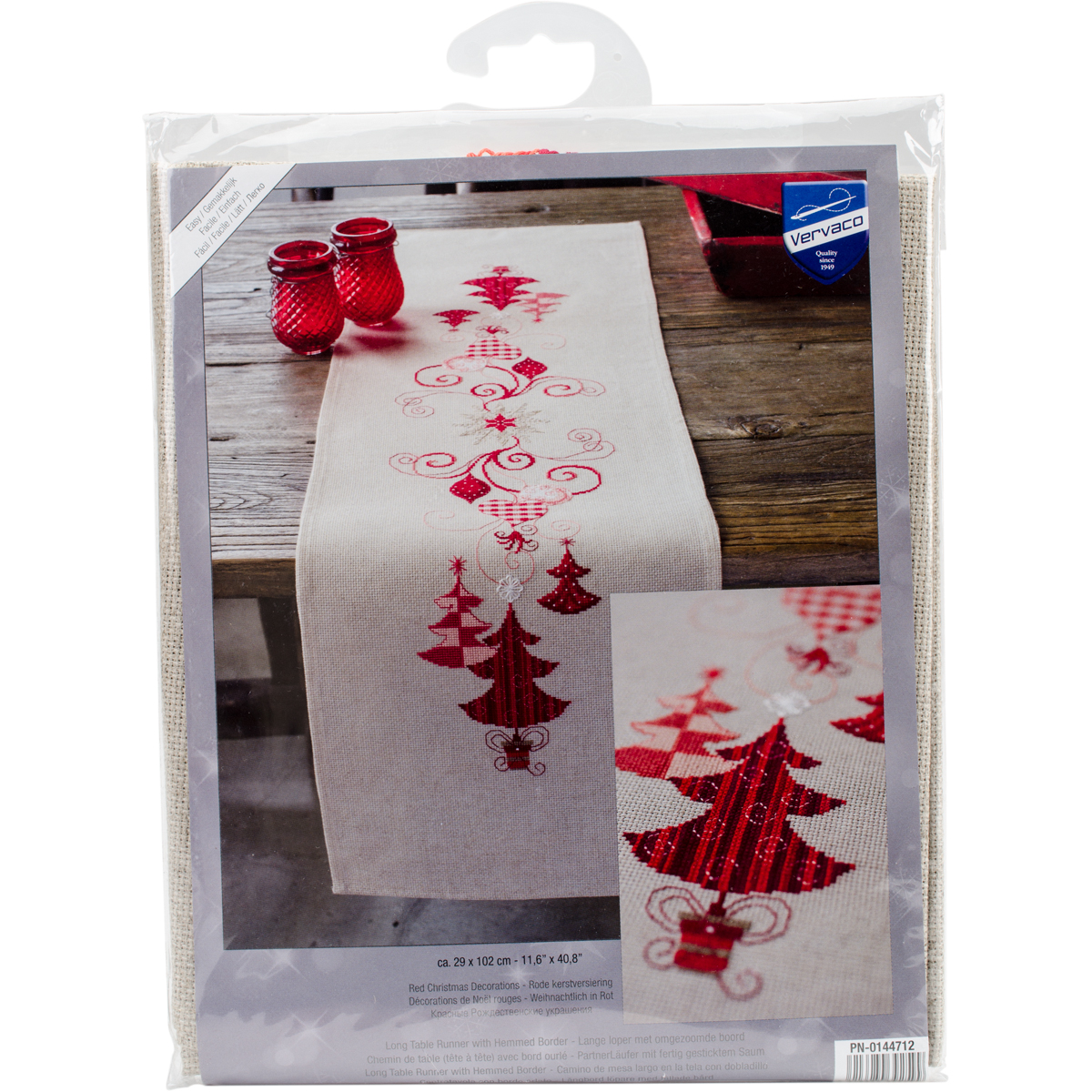 Vervaco-Table Runner Counted Cross Stitch Kit. Vervaco is internationally renowned as a leading manufacturer of high quality needlework kits. The printed on design disappears after washing! This package contains one 14 count pre-finished printed Table runner, 100% cotton DMC floss, one needle and instructions. Finished Size: 40-4/5x11-3/5 inches. Design: Red Christmas Decorations. Machine washable. Imported.