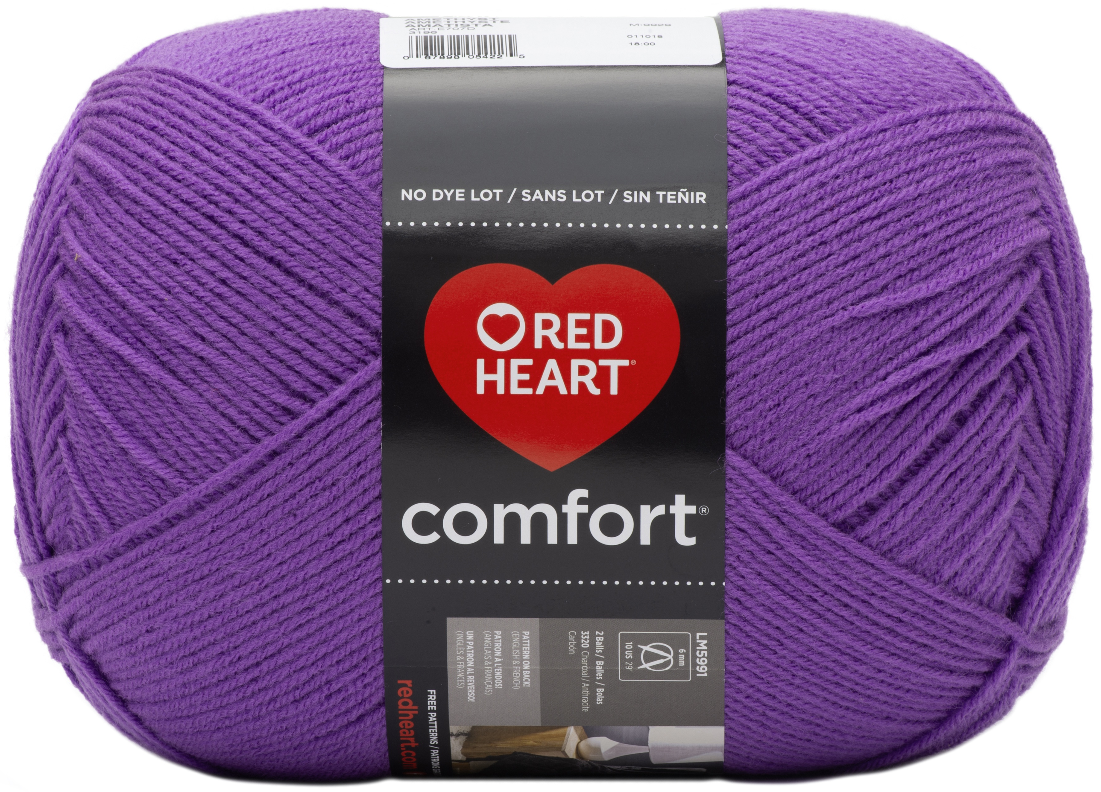 Red Heart-Comfort Yarn. This worsted weight yarn comes in an excellent color range including both solids and prints. Weight category: 4. Content: 100% Acrylic. Put up: Solids-16oz/454g 867yds/792m. Multi-12oz/240g 649yds/593m. Gauge: Knit-18st x 24r = 4in/10cm in size US7/4.5mm needles. Crochet-13sc x 17r = 4in/10cm on size I9/5.5mm hooks. No dyelot solids. Dyelotted Multi's: We try but are not always able to match dyelots. Care: Machine wash tumble dry do not bleach do not iron dry cleanable. Made in USA.