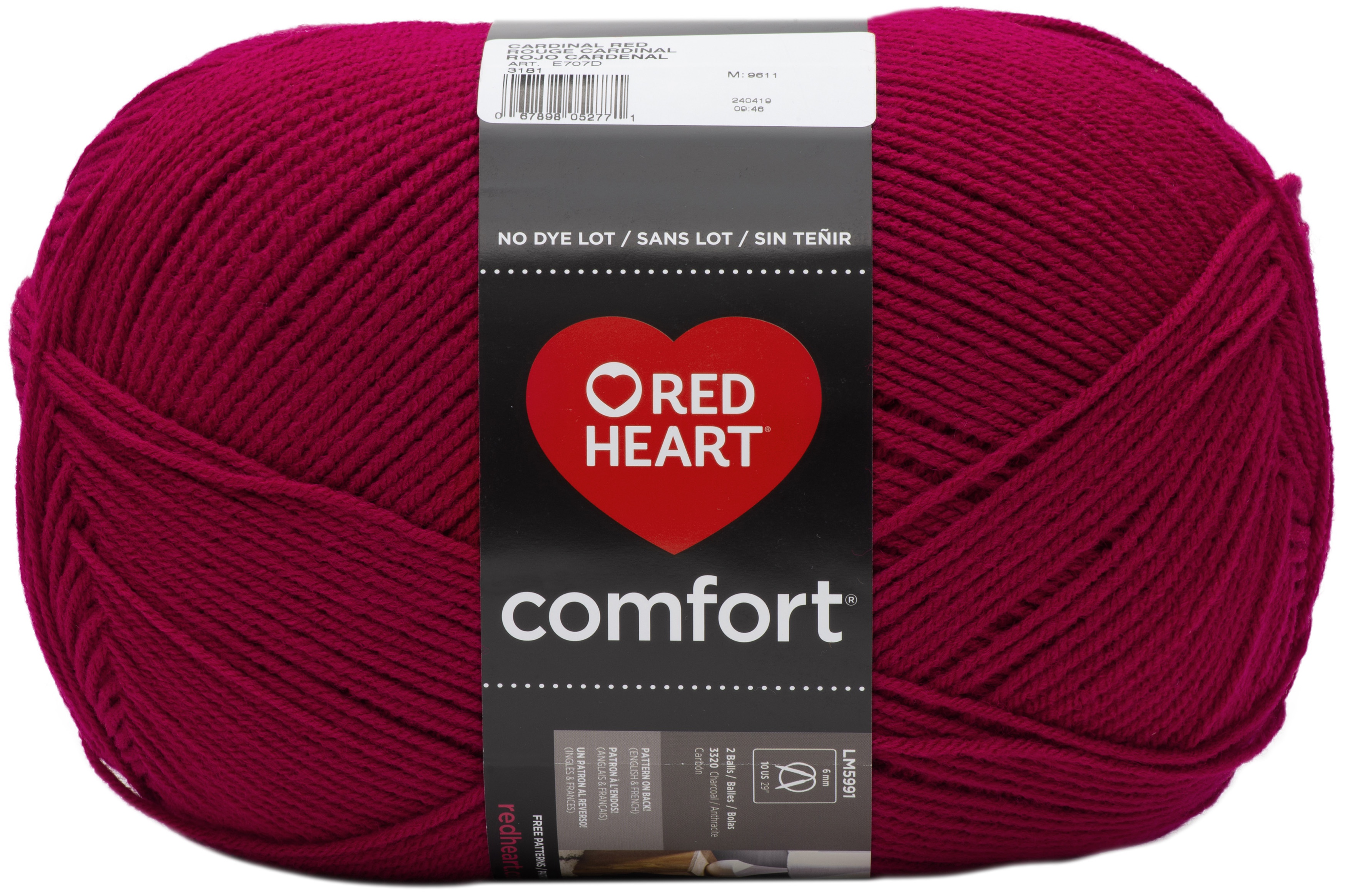 Red Heart-Comfort Yarn. This worsted weight yarn comes in an excellent color range including both solids and prints. Weight category: 4. Content: 100% Acrylic. Put up: Solids-16oz/454g 867yds/792m. Multi-12oz/240g 649yds/593m. Gauge: Knit-18st x 24r = 4in/10cm in size US7/4.5mm needles. Crochet-13sc x 17r = 4in/10cm on size I9/5.5mm hooks. No dyelot solids. Dyelotted Multi's: We try but are not always able to match dyelots. Care: Machine wash tumble dry do not bleach do not iron dry cleanable. Made in USA.
