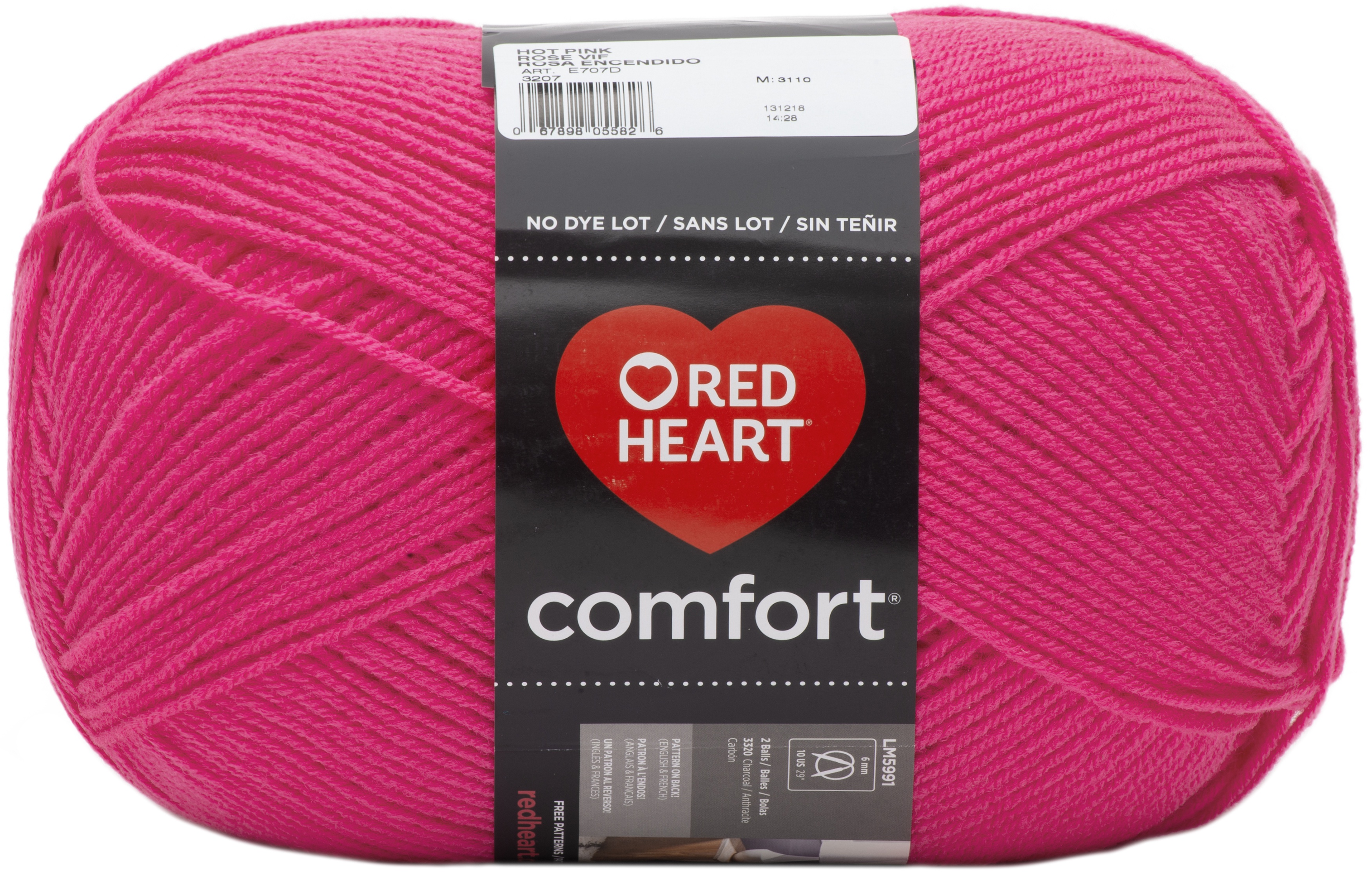 Red Heart-Comfort Yarn. This worsted weight yarn comes in an excellent color range including both solids and prints. Weight category: 4. Content: 100% Acrylic. Put up: Solids-16oz/454g 867yds/792m. Multi-12oz/240g 649yds/593m. Gauge: Knit-18st x 24r = 4in/10cm in size US7/4.5mm needles. Crochet-13sc x 17r = 4in/10cm on size I9/5.5mm hooks. No dyelot solids. Dyelotted Multi's: We try but are not always able to match dyelots. Care: Machine wash tumble dry do not bleach do not iron dry cleanable. Made in USA.