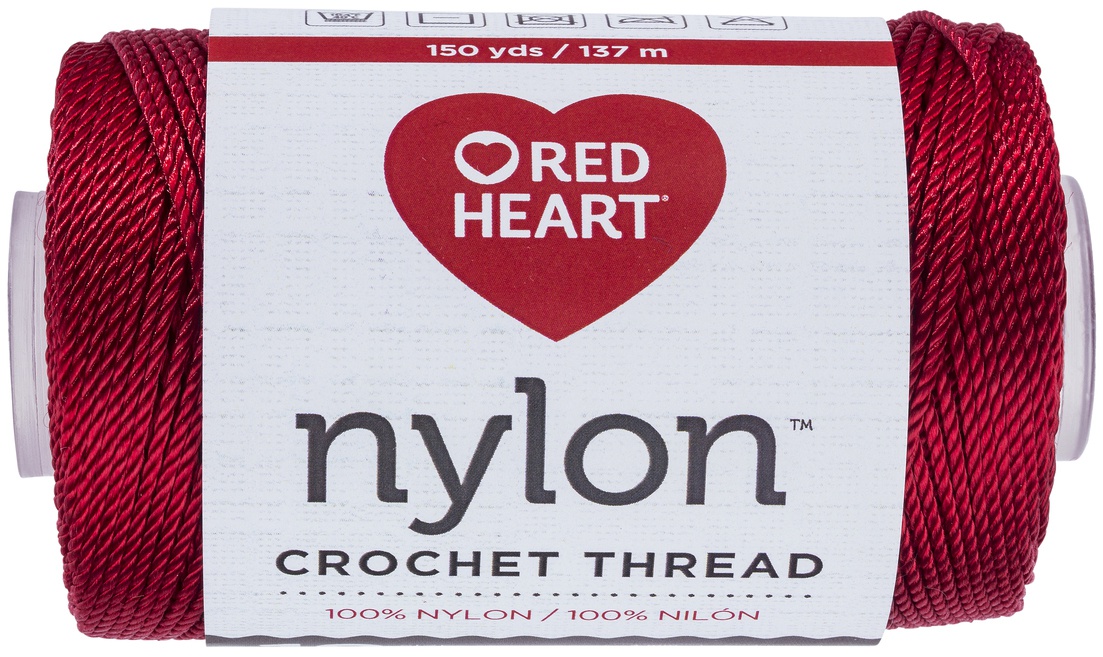 Red Heart-Nylon Crochet Thread. The perfect crochet nylon for home decor, apparel, and accessories. Size: 18. Made of 100% Nylon. Putup: 150yd/137m. Recommended Crochet Hook US G6/4mm, recommended knitting needles US6/4mm. Dyelotted: we try but are not always able to match dyelots. Care: Machine wash gentle, no bleach, dry flat. Comes in a variety of colors. Each sold separately. Imported.