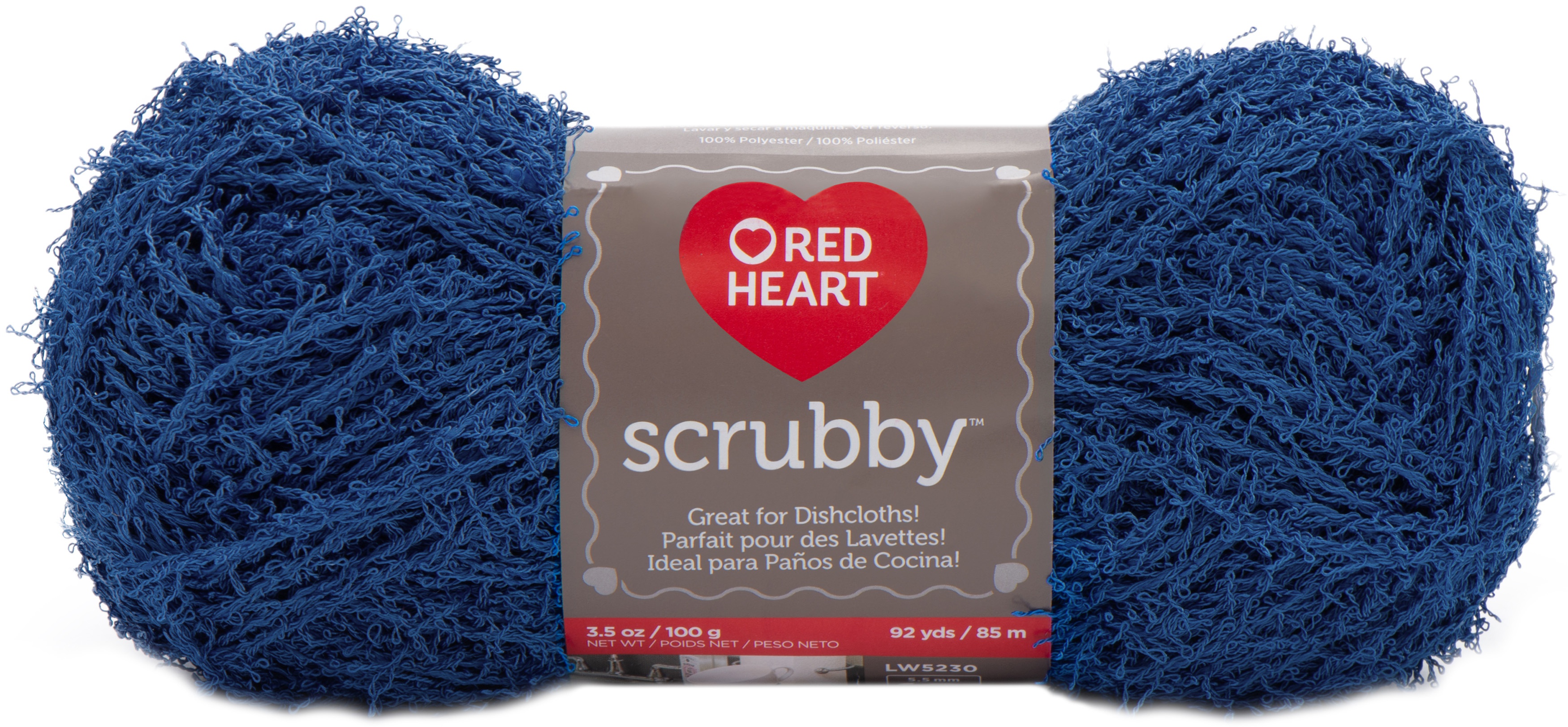 Coats Yarn-Red Heart Scrubby Yarn. This textured yarn will make scrubbing dirty pots a lot easier than regular dishcloth cotton. Knit or crochet your way to clean. Weight category: 4. Content: 100% polyester. Solid Putup: 3.5oz/100g, 92yds/85m. Multi Putup: 3oz/85g, 78yds/71m. Gauge: 16s x 21r = 4in/10cm on size US8/5mm knitting needles. Crochet: 13sc x 15r = 4in/10cm with size I- 9/5.5mm crochet hook. Care: machine was cold gently cycle, tumble dry, do not bleach or iron, dry clean with P solvents only. Comes in a variety of colors. Each sold separately. Imported.