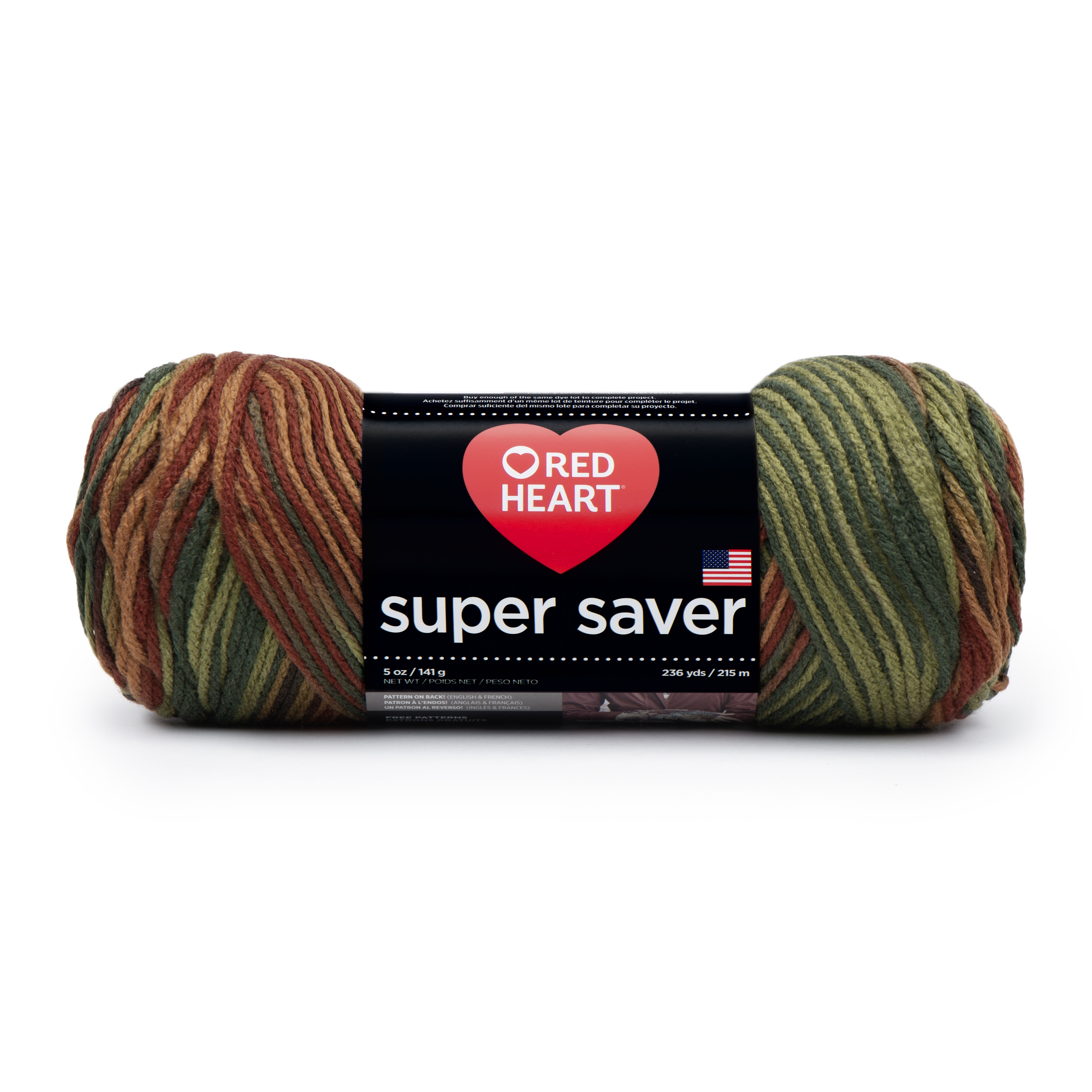 Red Heart-Super Saver Yarn. This medium weight has been America's bestselling yarn for over seventy years! Perfect for all knit and crochet projects. Weight category: 4. Content Solids & Multi: 100% acrylic. Content Flecks: 96%acrylic/4% other fibers. Putup Multi & Flecks: 5oz/141g, 236yd/215m. Putup Solids: 7oz/198g, 364yd/333m. Gauge: 17st x 23r = 4in/10cm on size US8/5mm knitting needles, Suggested crochet hook size I9/5.5mm hook. Dyelotted: We try but are not always able to match dyelots. Solids are not Dyelotted. Care: machine wash, tumble dry, do not bleach, do not iron, dry cleanable. Made in USA.