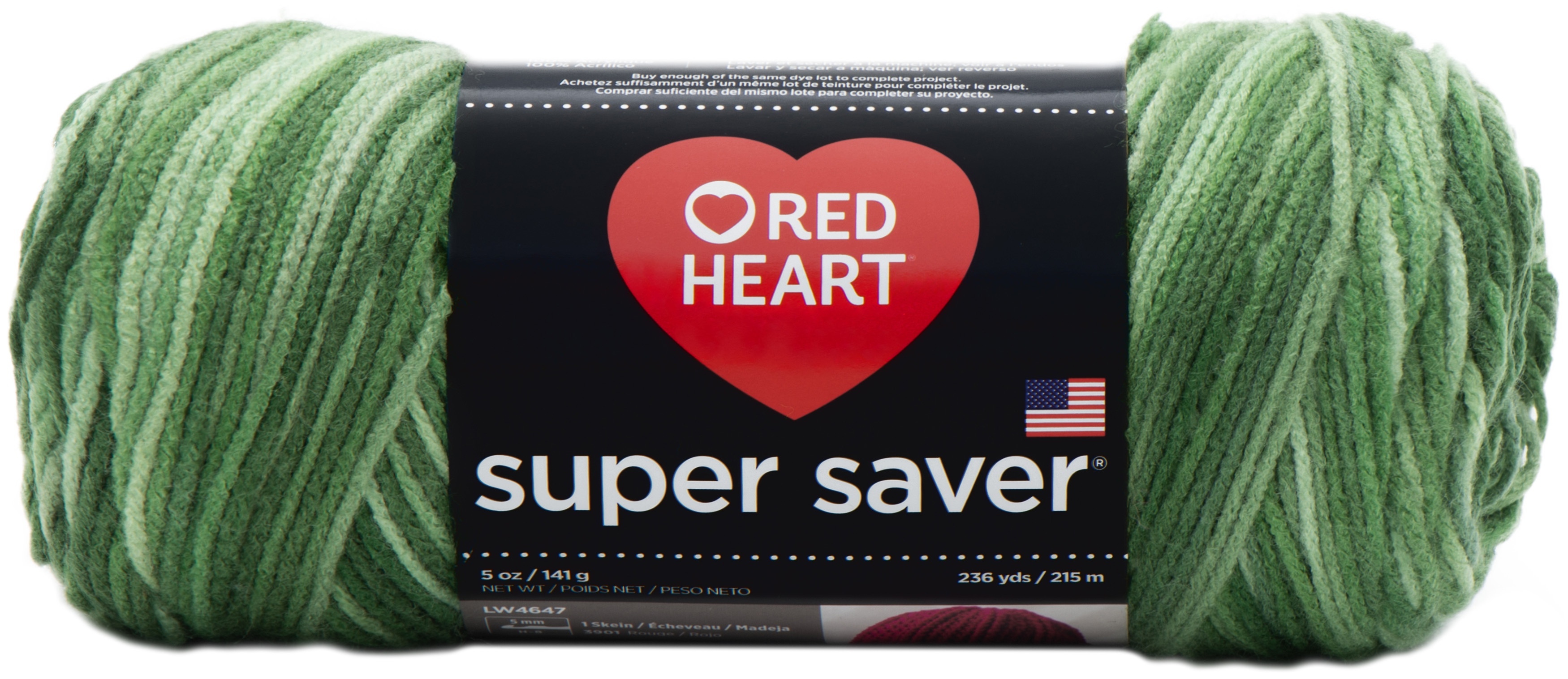 Red Heart-Super Saver Yarn. This medium weight has been America's bestselling yarn for over seventy years! Perfect for all knit and crochet projects. Weight category: 4. Content Solids & Multi: 100% acrylic. Content Flecks: 96%acrylic/4% other fibers. Putup Multi & Flecks: 5oz/141g, 236yd/215m. Putup Solids: 7oz/198g, 364yd/333m. Gauge: 17st x 23r = 4in/10cm on size US8/5mm knitting needles, Suggested crochet hook size I9/5.5mm hook. Dyelotted: We try but are not always able to match dyelots. Solids are not Dyelotted. Care: machine wash, tumble dry, do not bleach, do not iron, dry cleanable. Made in USA.