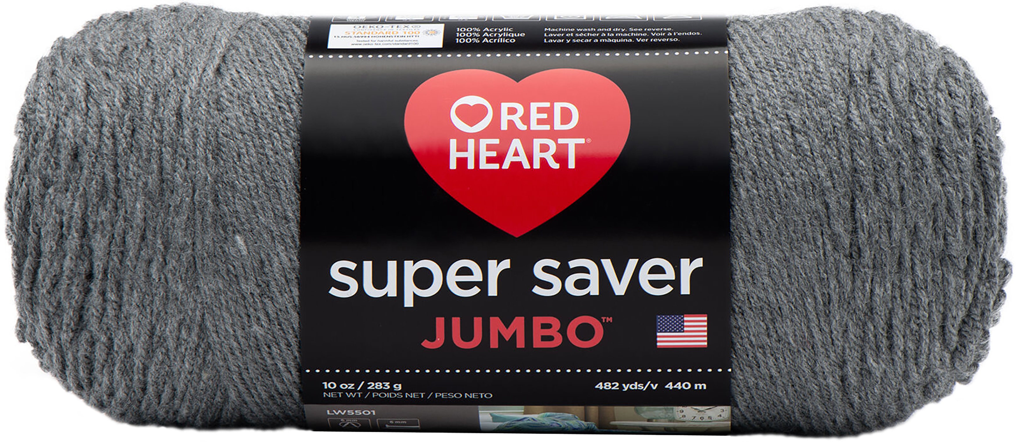 Red Heart-Super Saver Jumbo Yarn. This medium weight has been America's bestselling yarn for over seventy years! Perfect for all knit and crochet projects. Weight category: 4. Content Solids Heather & Multi: 100% acrylic. Putup Multi & Heather: 10oz/283g, 482yd/440m. Putup Solids: 14oz/396g, 744yd/680m. Gauge: 17stx23r= 4in/10cm on size US8/5mm knitting needles. Suggested crochet hook size I9/5.5mm hook. Multi & Heather Dyelotted: We try but are not always able to match dyelots. Solids are not Dyelotted. Care: machine wash, tumble dry, do not bleach, do not iron, dry cleanable. Made in USA.