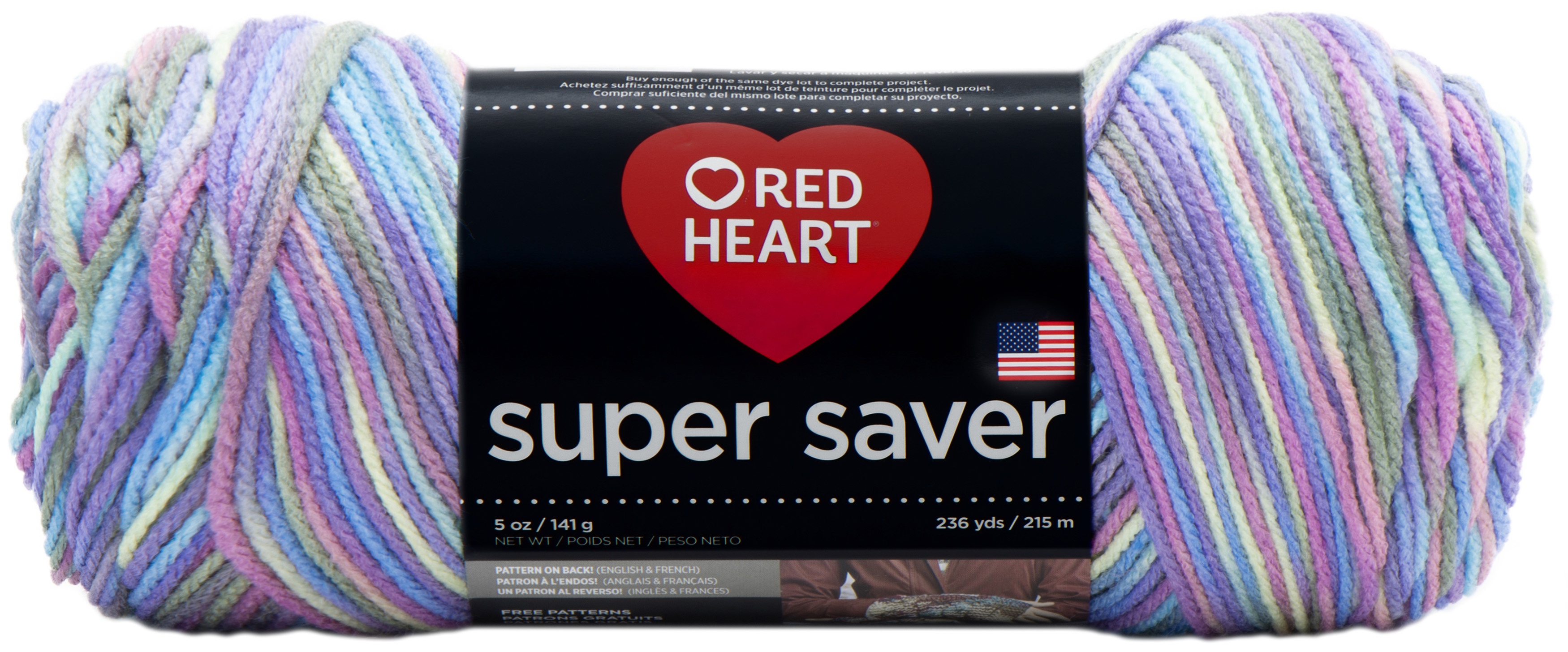 Red Heart-Super Saver Yarn. This medium weight has been America's bestselling yarn for over seventy years! Perfect for all knit and crochet projects. Weight category: 4. Content Solids & Multi: 100% acrylic. Content Flecks: 96%acrylic/4% other fibers. Putup Multi & Flecks: 5oz/141g, 236yd/215m. Putup Solids: 7oz/198g, 364yd/333m. Gauge: 17st x 23r = 4in/10cm on size US8/5mm knitting needles, Suggested crochet hook size I9/5.5mm hook. Dyelotted: We try but are not always able to match dyelots. Solids are not Dyelotted. Care: machine wash, tumble dry, do not bleach, do not iron, dry cleanable. Made in USA.