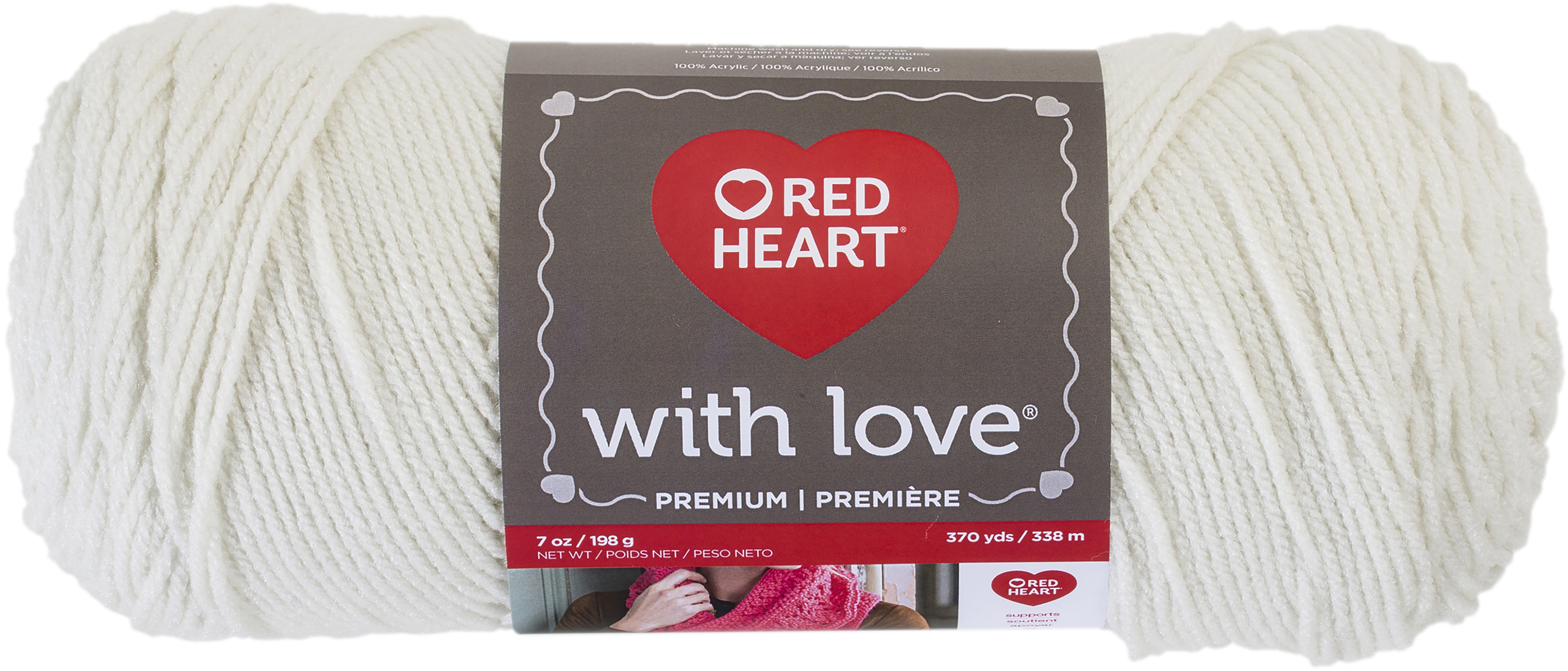 Red Heart-With Love Yarn. This medium weight has an ultra-soft, premium acrylic yarn perfect for throws, garments and accessories! Perfect for all knit and crochet projects. Weight category: 4. Content Solids & Multi: 100% acrylic. Putup Multi: 5oz/141g, 230yd/211m. Putup Solids: 7oz/198g, 370yd/338m. Gauge: 16s x 22r = 4in/10cm on size US9/5.5mm knitting needles, Suggested crochet hook size K10.5/6.5mm hook. Dyelotted: We try but are not always able to match dyelots. Care: machine wash, tumble dry, do not bleach, do not iron, dry clean with P solvents only. Made in USA.