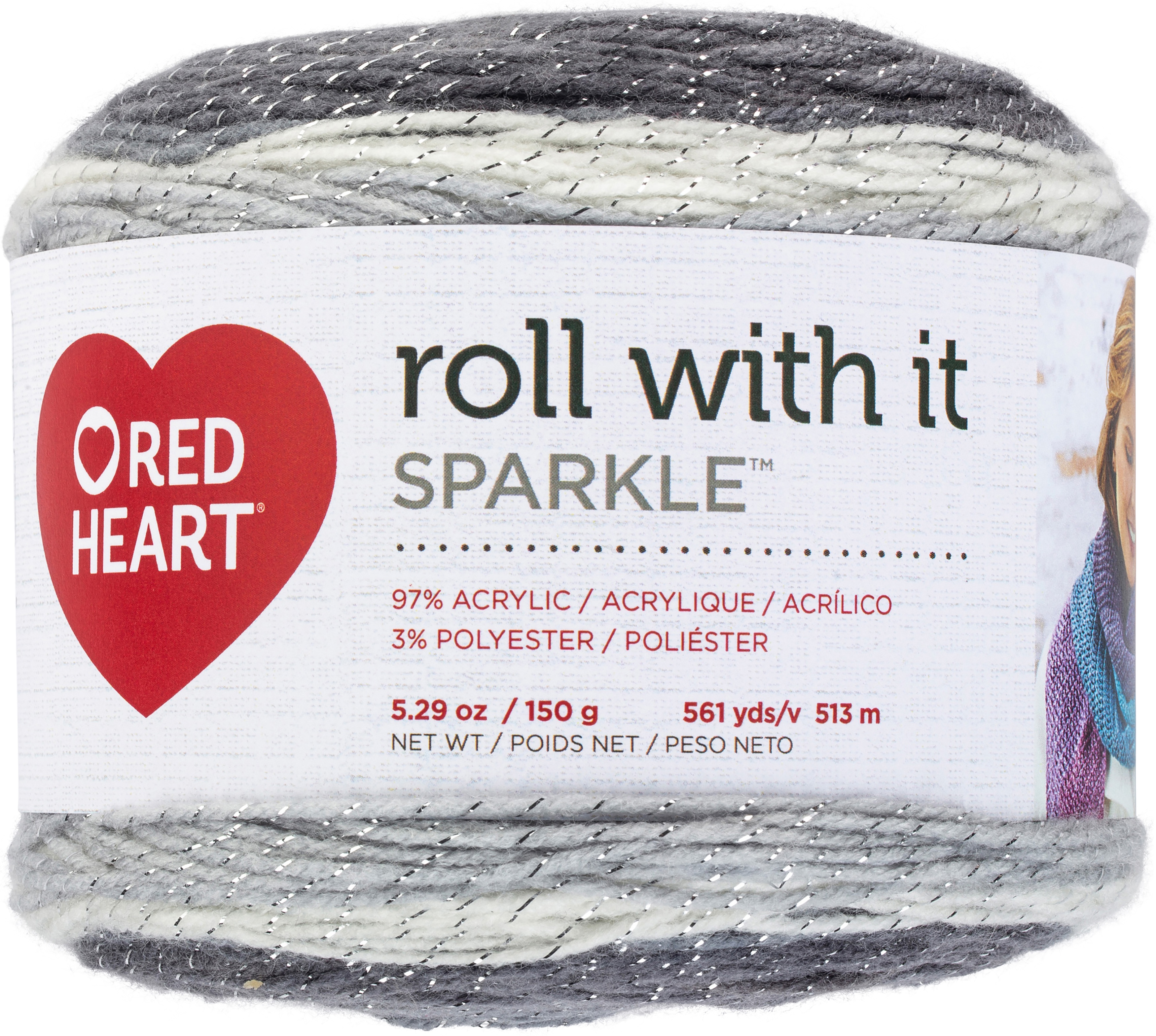 RED HEART-Roll With It Sparkle. Fun cake-style yarn with added sparkle! Super trendy, this yarn will make fantastic accessories and fashions that will get you noticed! Weight category: 4. Content: 97% acrylic, 3% polyester. Putup: 5.29oz/150g, 561yd/513m. Gauge: 19sx25r = 4in/10cm on size US8/5mm knitting needles. Suggested crochet hook: I-9/5.5mm. Dyelotted: we try but are not always able to match dyelots. Care: machine wash warm, gentle cycle. Tumble dry low, do not overdry. Do not iron, do not bleach. Comes in a variety of colors. Each sold separately. Imported.