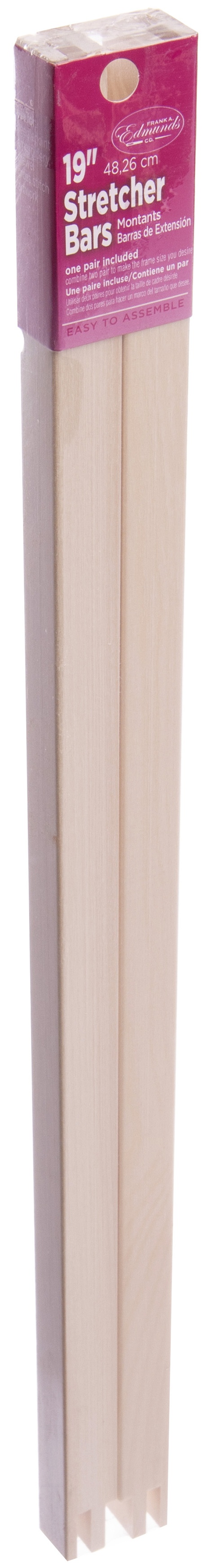 FRANK A EDMUNDS-These stretcher bars are for needle arts and measure 19 long, 3/4 wide, and 3/4 in depth. Stretcher bars eliminate movement and keep work taut and clean. Combine any 2 sizes to form the exact frame desired. Wood is plain.