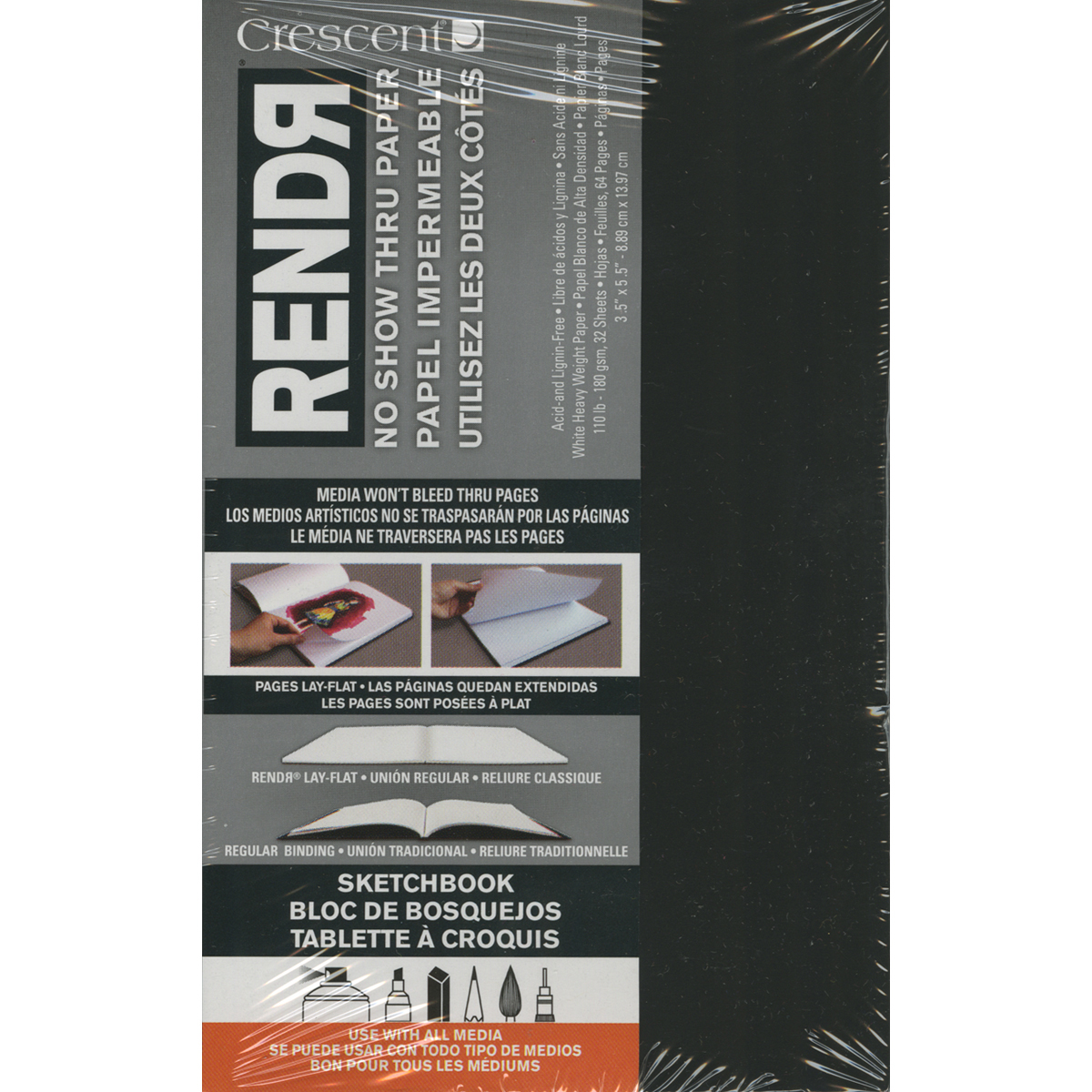 Crescent Cardboard-RENDR No Show Thru Lay Flat Sketch Book. A specially patented paper developed by Crescent that will not allow any bleed or show through from the other side of the paper, no matter what media is used. This revolutionary paper allows you to use 100% of the sketch book; no more limitations to what type of media you use in your work and no more tearing out the next page. This package contains thirty-two 5-1/2x3-1/2 inch 110 lb white heavy weight sheets. Acid and lignin free. Made in USA.