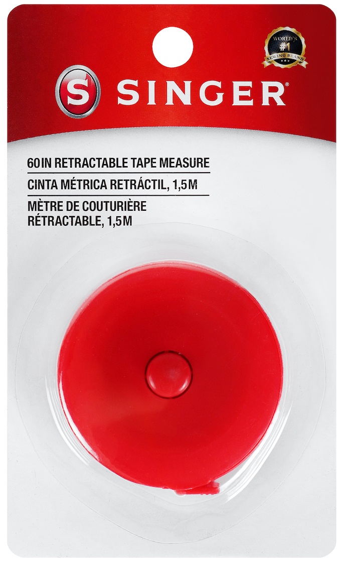 SINGER-60 long retractable tape in a red dispenser. Fiberglass. Printed in inches and centimeters. Pull tab to extend the tape measure, hold down button to retract.