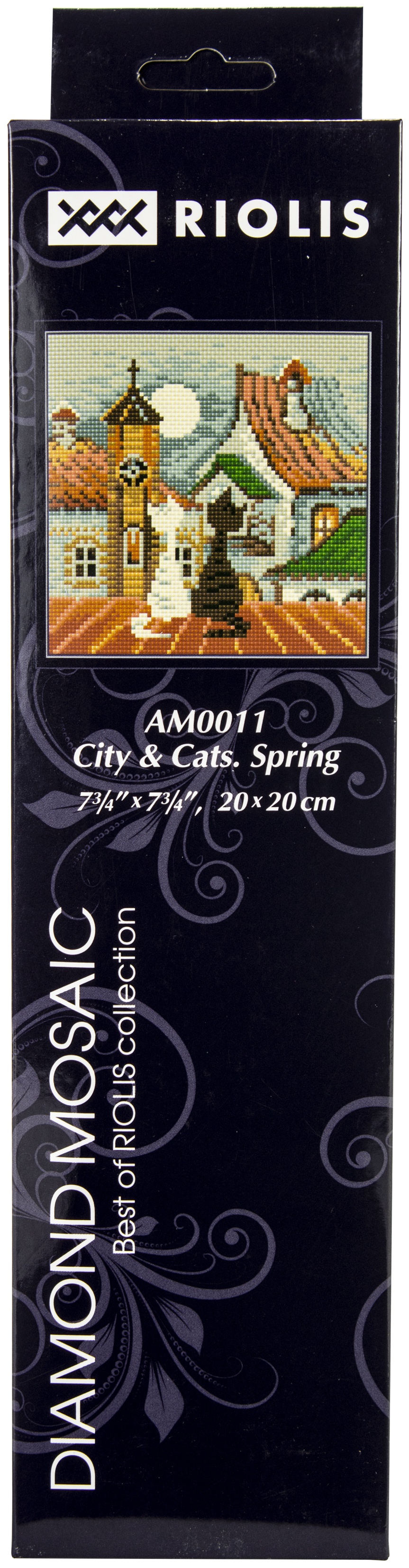 RIOLIS-Diamond Mosaic Kit. New tempting product from Best of RIOLIS collection! Express your love for arts and crafts with these beautiful diamond mosaic kits! Find a themed kit for any taste! This package contains adhesive canvas with colored chart, diamond mosaic pieces in fourteen colors, two trays, tweezers in PVC case, stylus, wax, resealable zipper storage bags, stickers for marking the bags, detailed instructions in six languages. Design: City & Cats Spring. Finished size 7.75X7.75 inches. Imported.