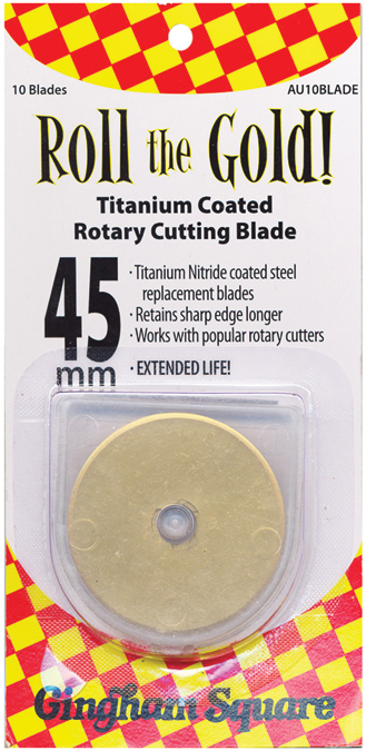 EURO-NOTIONS-Roll the Gold! Titanium Coated Rotary Cutting Blades. These steel replacement blades are coated with Titanium Nitride which means they retain a sharp edge longer so you can cut more! These 45mm blades will fit in most popular rotary cutters and are perfect for a variety of sewing and crafting projects. This package contains ten 45mm blades in handy little storage case. Caution: Blades are extremely sharp: handle with care. Imported.