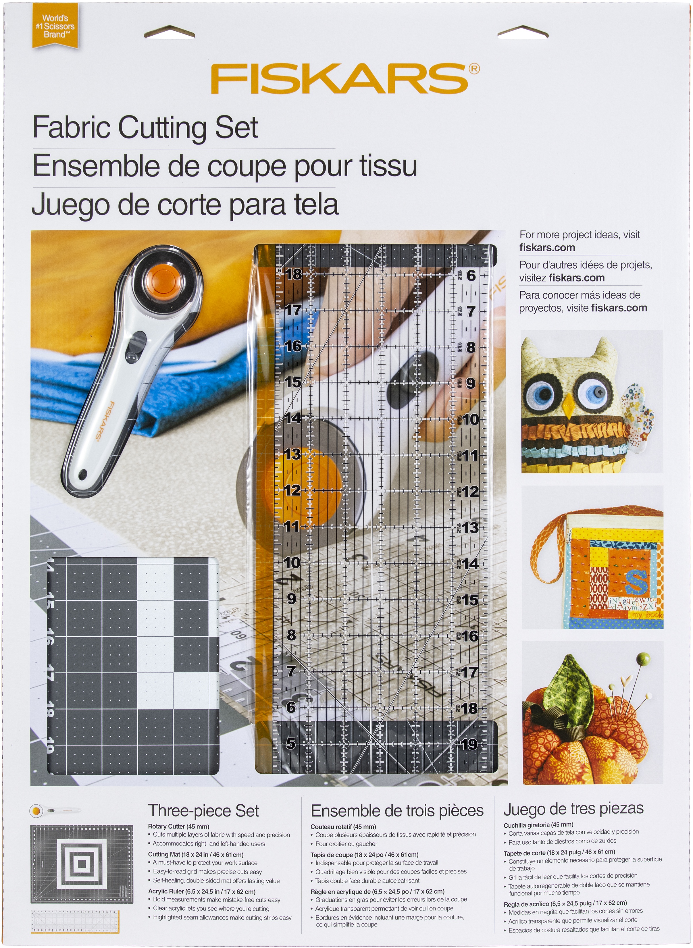 FISKARS-Quilting Rotary Cutter Set. Everything you need to start quilting! Fiskars has combined its popular 45mm rotary cutter with cutting mat and acrylic ruler to create a convenient sewing and quilting tool set. Whether you are headed to quilting class, getting together with friends, or leaving town for a relaxing weekend, this 3-in-1 combo is the perfect companion. This package contains one 45mm Rotary Cutter, one 24x18 inches self-healing, double-sided Cutting Mat, and one 24-1/2x6-1/2 inches Acrylic Ruler. Imported.
