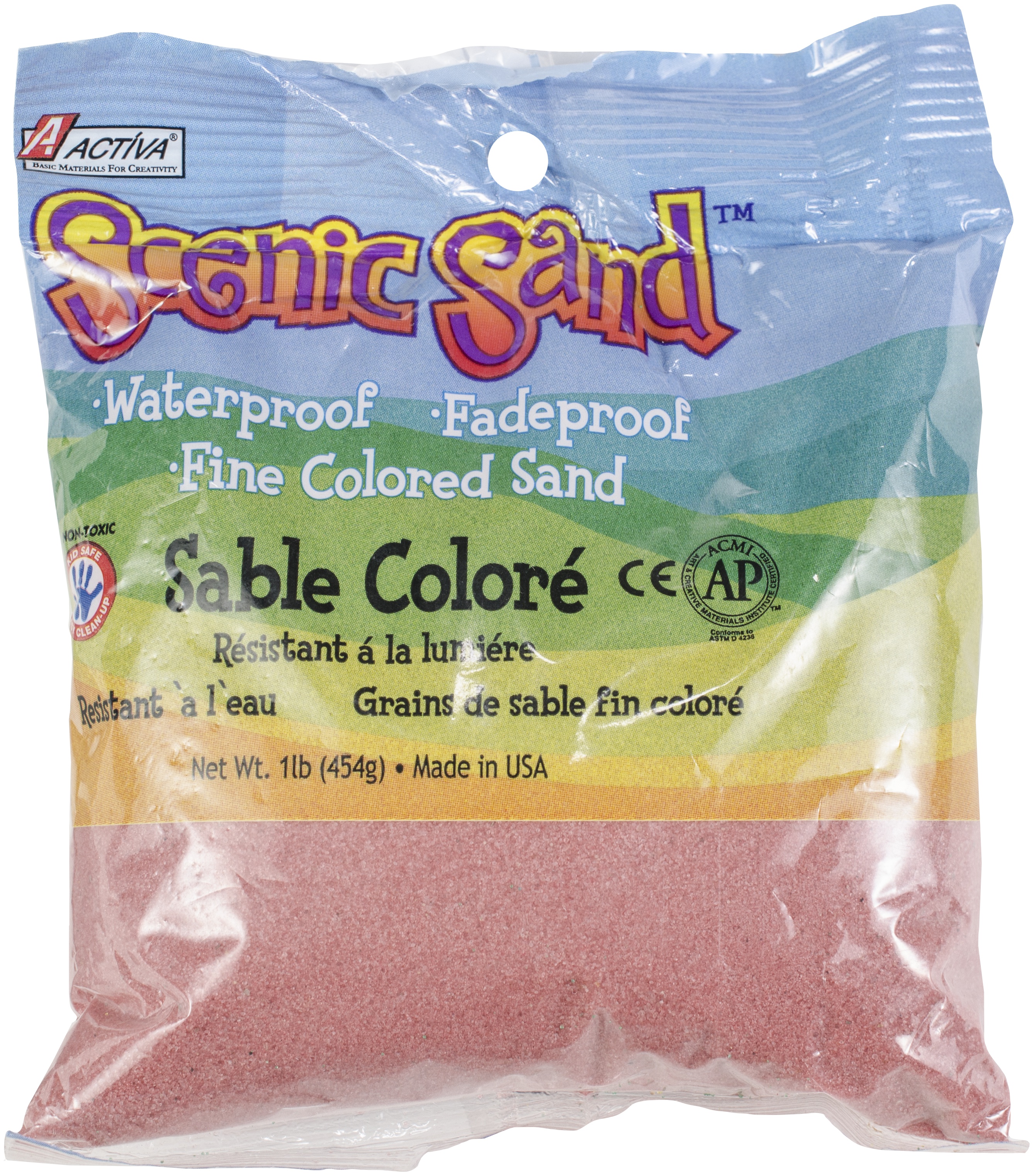 ACTIVA PRODUCTS-Scenic sand is used to make colorful sand art bottles, artistic sand art paintings, and a variety of other decorative craft projects. Comes in assorted colors and is perfect for just plain fun! Waterproof and fadeproof. Non-toxic. Many colors available. Made in USA.