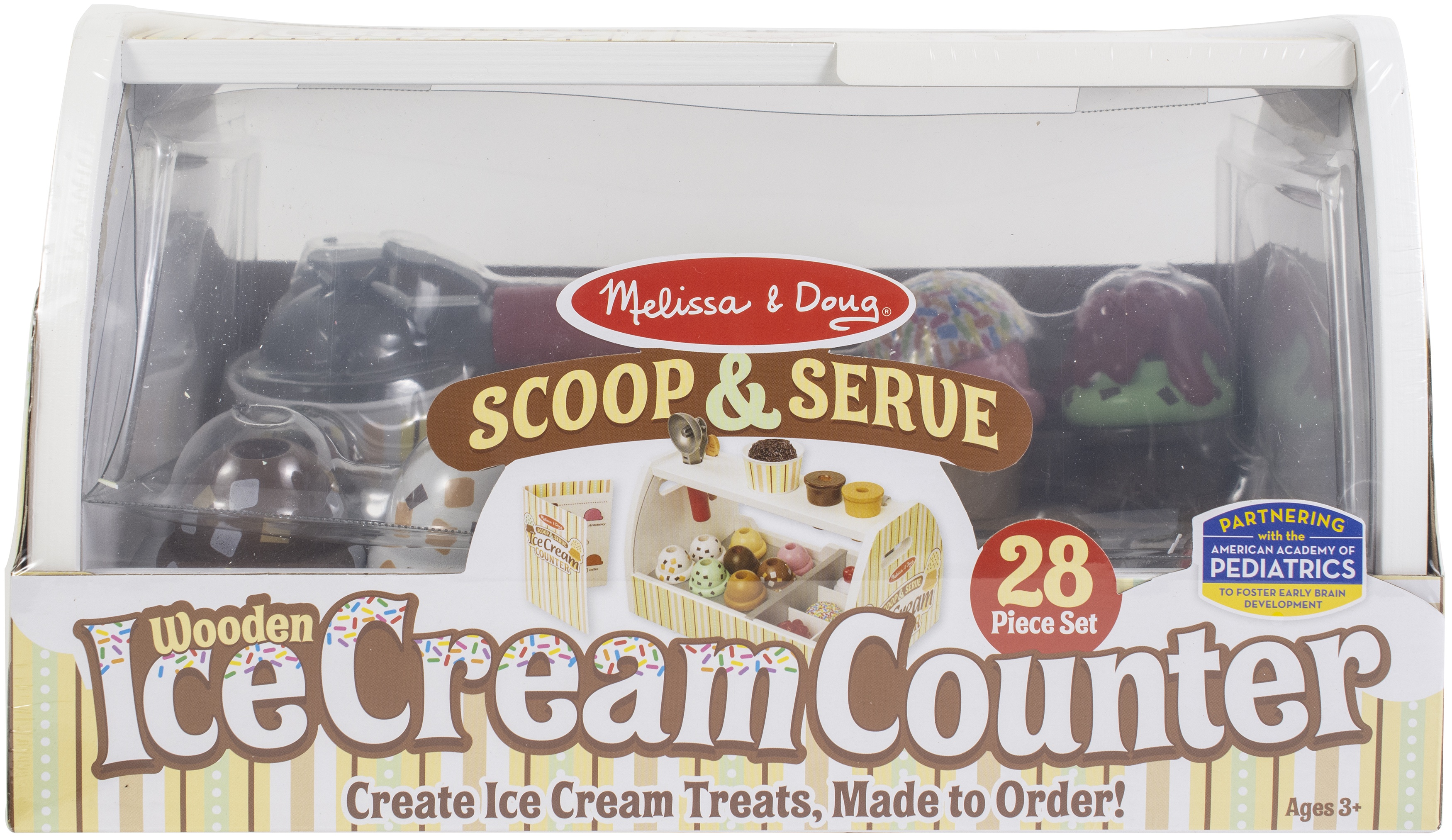 Scoop up some cool treats with this all-inclusive, 20-piece pretend play ice cream counter! The sturdy wooden tabletop counter holds eight wooden scoops of different-flavored ice cream, six assorted toppings, two cones, a plastic cup, an ice cream scooper and a wooden spoon. The scooper fits into a hole on top of the scoops to lift, stack, and release. Take orders on the reusable menu card and serve up delicious fun!