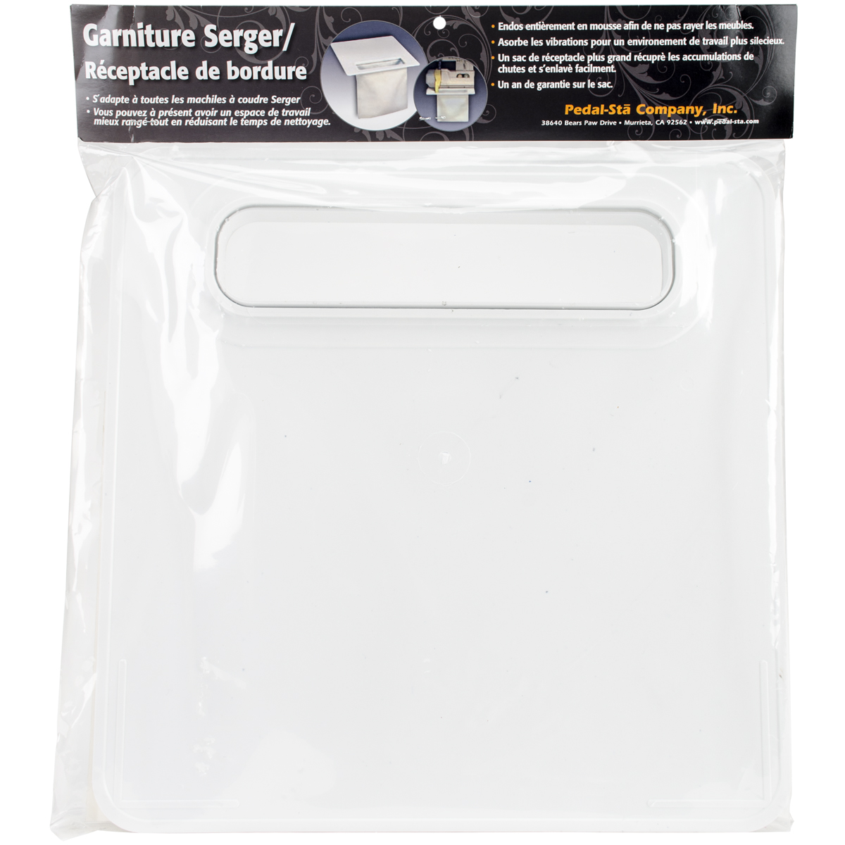 PEDAL STA-Serger Pad/Trim Catcher is a large 12 x 12 pad area that fits under all sizes of major brand sewing machines. The special foam backing absorbs machine vibrations. Protects table surface and prevents machine from crawling. The trim catcher bag quickly detaches for easy removal of contents. Helps prevent scrap waste from cluttering floor. Makes the work area safer. Work-saving, convenient, and cost effective! The polyethylene foam bottom can be placed directly on furniture without scratching. Provides a quieter work environment. Made of selected material to withstand rugged physical abuse. Measures: 12 x 12.