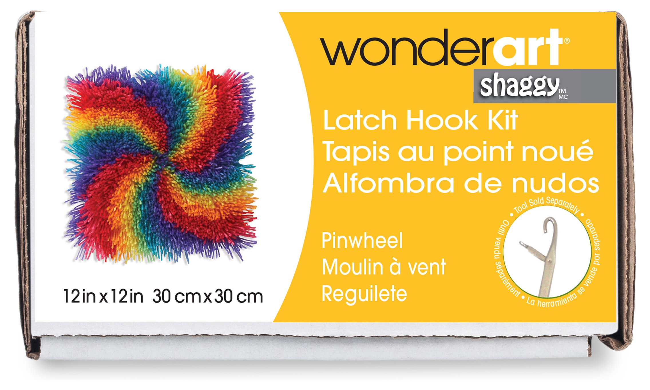 CARON-Wonderart Latch Hook Kit: Pinwheel. These small kits are ideal for beginners or quick weekend projects. When finished, they can be made into table top decorations or to decorate a wall! This package includes one 12x12 inch pinwheel canvas (50% polyester/50% cotton), pre-cut rug yarn (100% acrylic), illustrated instructions on how to latch a hook and one easy-to- follow chart. Latch hook tool and binding not included. Hand wash or dry clean. Made in USA.