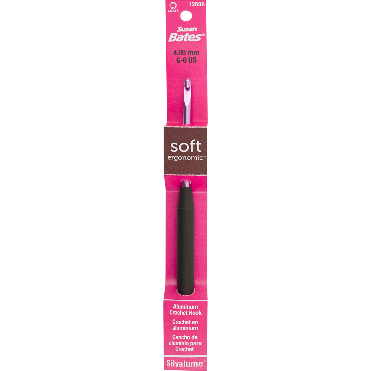 Aluminum Susan Bates in-line hook head for uniform stitches and reduced wrist strain. This crochet hook has a velvety smooth ergonomic handle. This package contains one 5.5 inch long crochet hook. Comes in a variety of sizes. Each sold separately. Imported.