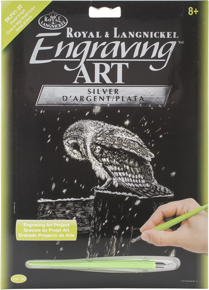ROYAL LANGNICKEL-Engraving Art. Easy to use Engraving Art allows you to create fantastic foil artwork. You simply scrape the lines that are pre-printed on the board with the provided tool. This package contains one 10x8in pre-printed board, a practice board and scraping tool. Available in Silver, Gold, Copper, holographic, rainbow and more: each sold separately. Recommended for children ages 8 and up. WARNING: Functional Sharp Object. Not for children under 3 years. Imported.