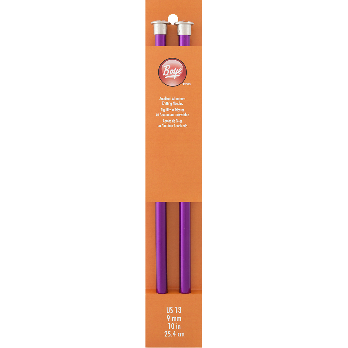 BOYE-Aluminum Single Point Knitting Needles: 10in. Boye's knitting needles are precisely sized and accurately balanced. The unique Perfection Points help prevent splitting of yarn for easy knitting. Available in all the popular color-coded sizes. Imported.