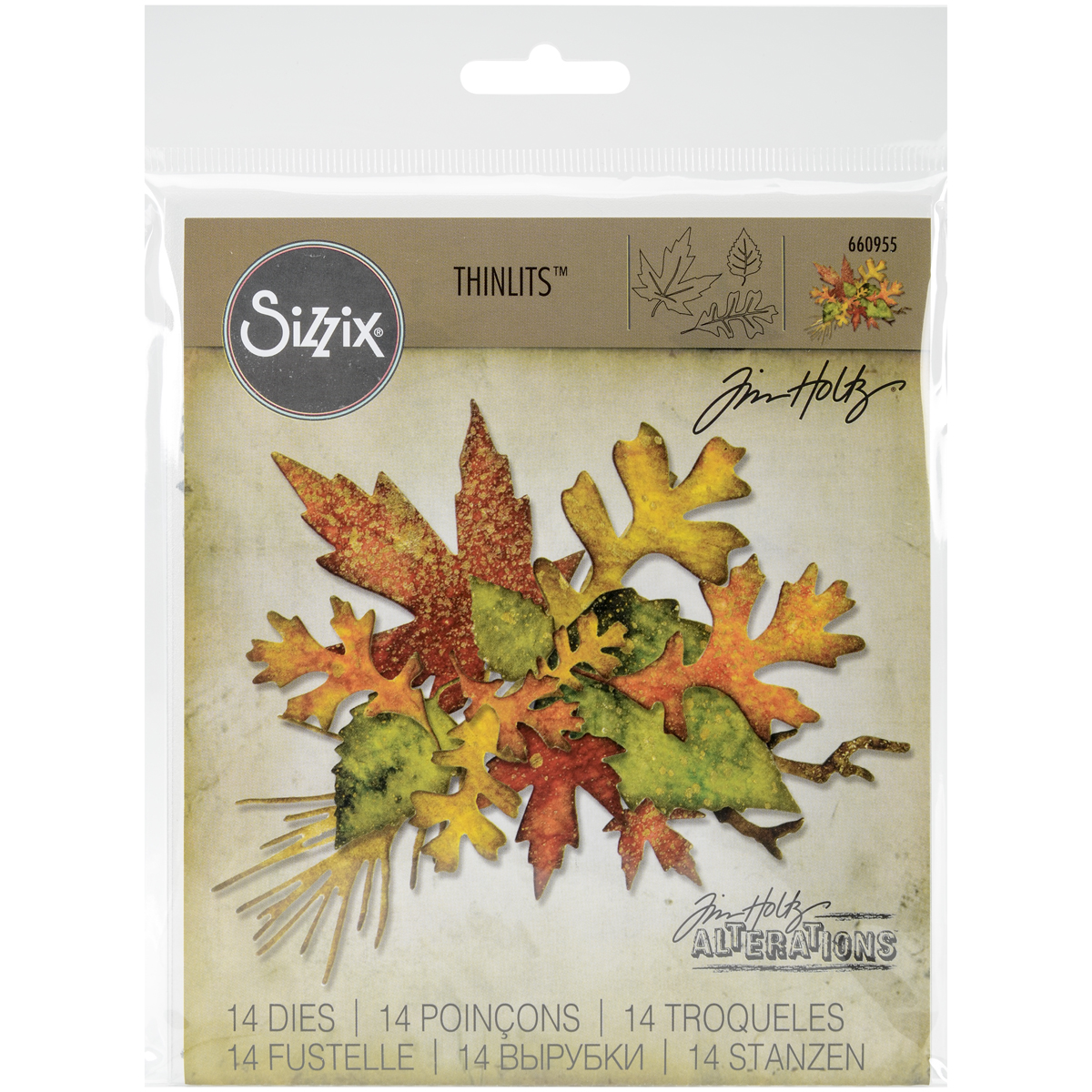 Sizzix-Thinlits Dies. Thinlit dies offer a variety of affordable solo options or multi die options. Thinlits are easy to use and are compact and portable. These dies are compatible with Sizzix BIGkick, BigShot and Vagabond. This package contains fourteen dies. Design: Fall Foliage (measuring between 5/8x1 inches and 2-1/8x2- 1/2 inches). Designer: Tim Holtz. Imported.