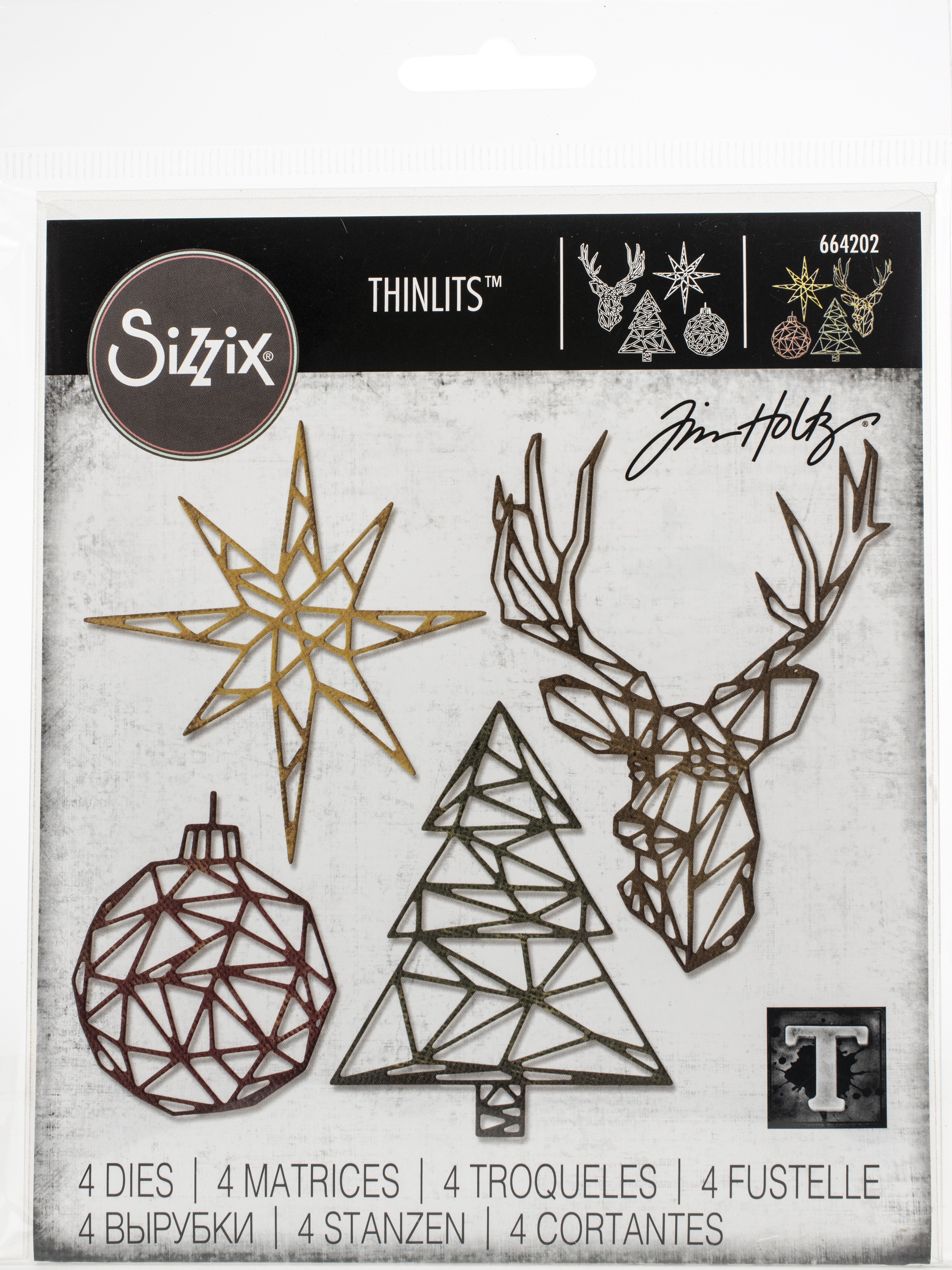 Thinlit dies offer a variety of affordable solo options or multi die options. Thinlits are easy to use and are compact and portable. These dies are compatible with Sizzix BIGkick, BigShot, and Vagabond. This package contains Geo Christmas: a set of four metal dies measuring between 1.875x2.375 inches and 2.875x3.875 inches. Designer: Tim Holtz. WARNING: Choking Hazard. Not suitable for children under 3 years. WARNING: Cut Hazard, Sharp Blade. Imported.