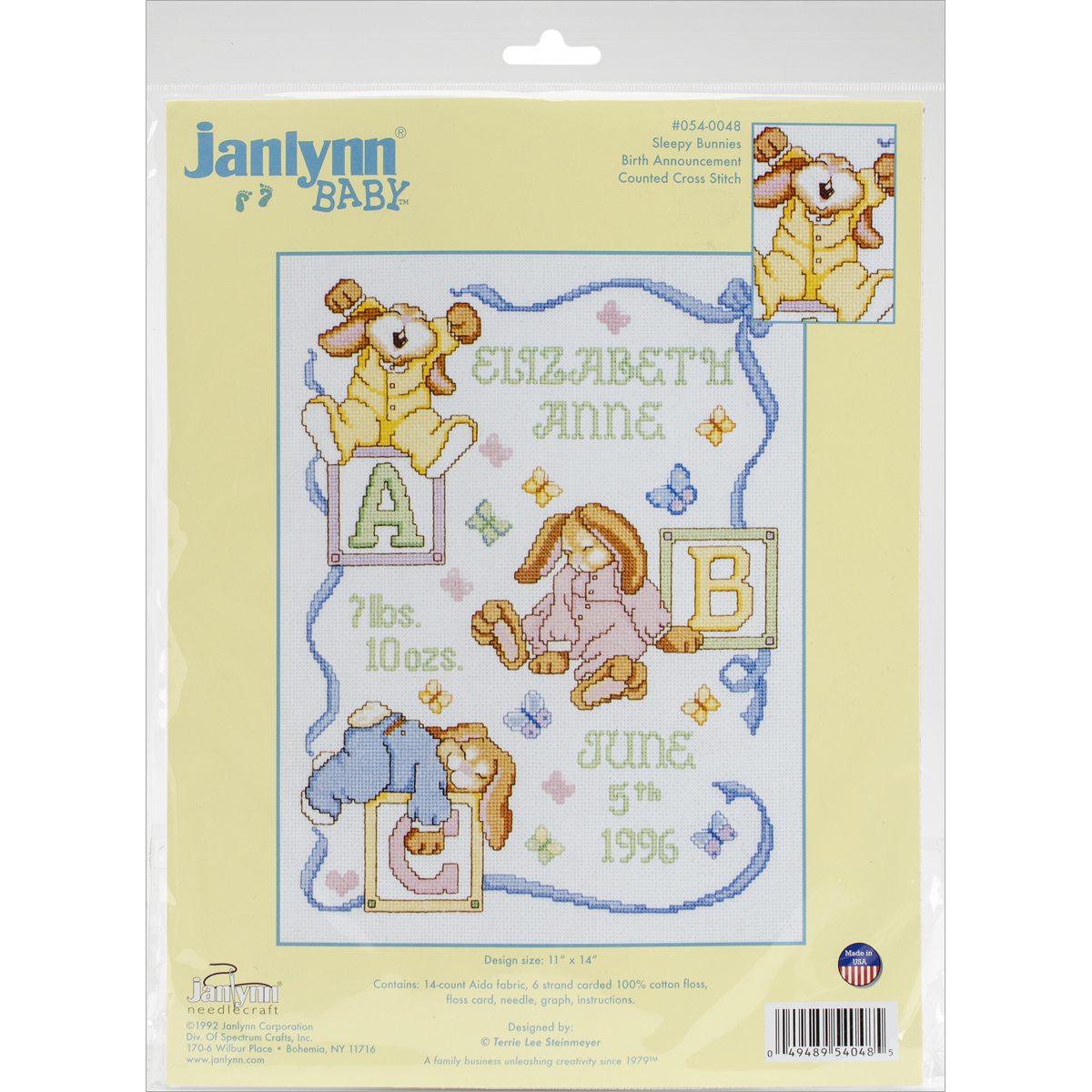 JANLYNN-Counted Cross Stitch Kit. Creative designs and quality products are put in to each of Janlynn's kits. This kit contains 14 count Aida, cotton floss, needle, graph and instructions. Design: Sleeping Bunnies Sampler. Finished dimensions: 11x14in (mat and frame are not included). Made in USA.