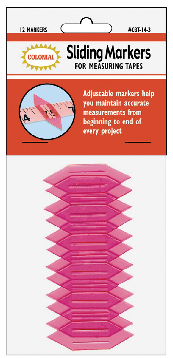 COLONIAL NEEDLE-Sliding Markers For Measuring Tapes. Adjustable markers help you maintain accurate measurements from beginning to end of every project. Can be used with most tape measures no more than 5/8 inch wide. Color: translucent pink. Imported.