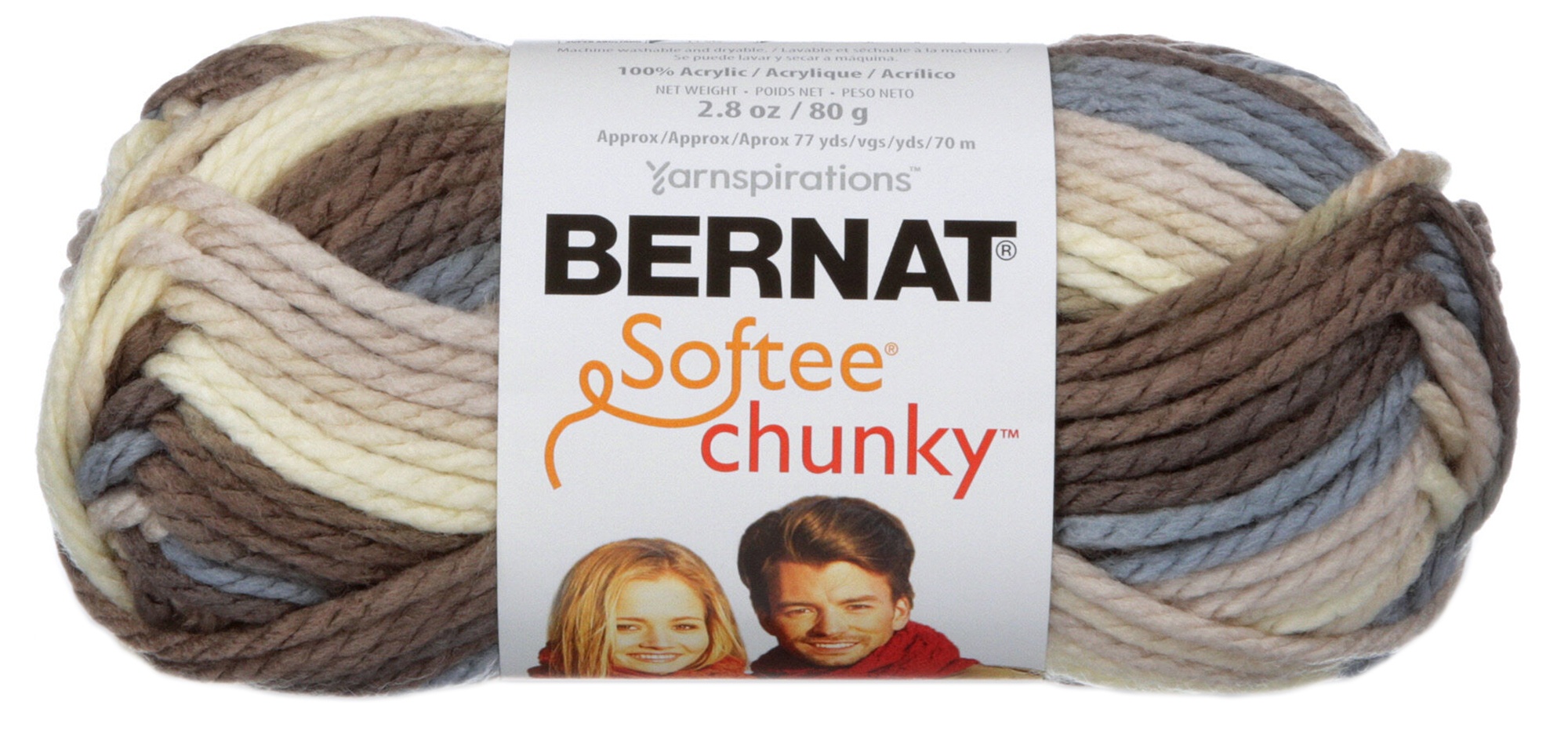 BERNAT-Softee Chunky Yarn: Ombre. This yarn is a chunky weight yarn that features an extensive shade range. It is an easy-care and long- wearing premium ultra-soft acrylic yarn-- perfect for afghans, sweaters, coats and much more. Weight category: 5. Content: 100% Acrylic, 2.8oz/80g, 77yd/70m. Gauge: Knit: 11st x 14r = 4in/10cm on size US11/8mm needles, Crochet: 7sc x 8r = 4in/10cm with L11/8mm hook. Care: machine wash, tumble dry, do not bleach, do not iron, do not dry clean. Dyelotted: we try but are not always able to match dye lots. Imported.