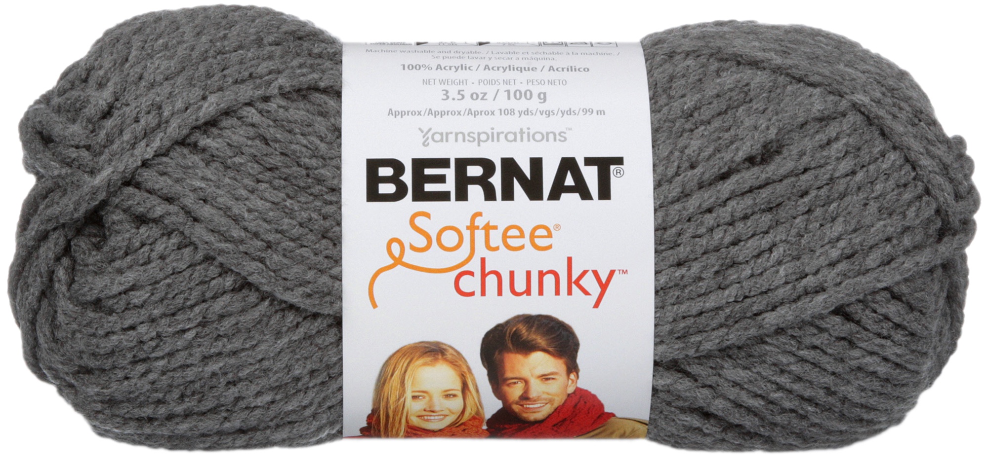 BERNAT-Softee Chunky Yarn: Solid. This yarn is a super chunky weight yarn that features an extensive shade range. It is an easy-care and long-wearing premium ultra-soft acrylic yarn with no dye-lot-perfect for afghans, sweaters, coats and much more. Weight category: 6.Content: 100% Acrylic, 3.5oz/100g, 108yd/99m. Gauge: Knit: 11st x 14r = 4in/10cm on size US11/8mm needles, Crochet: 7sc x 8r = 4in/10cm with L11/8mm hook. Care: machine wash, tumble dry, do not bleach, do not iron, do not dry clean. Dyelotted: we try but are not always able to match dyelots. Imported.
