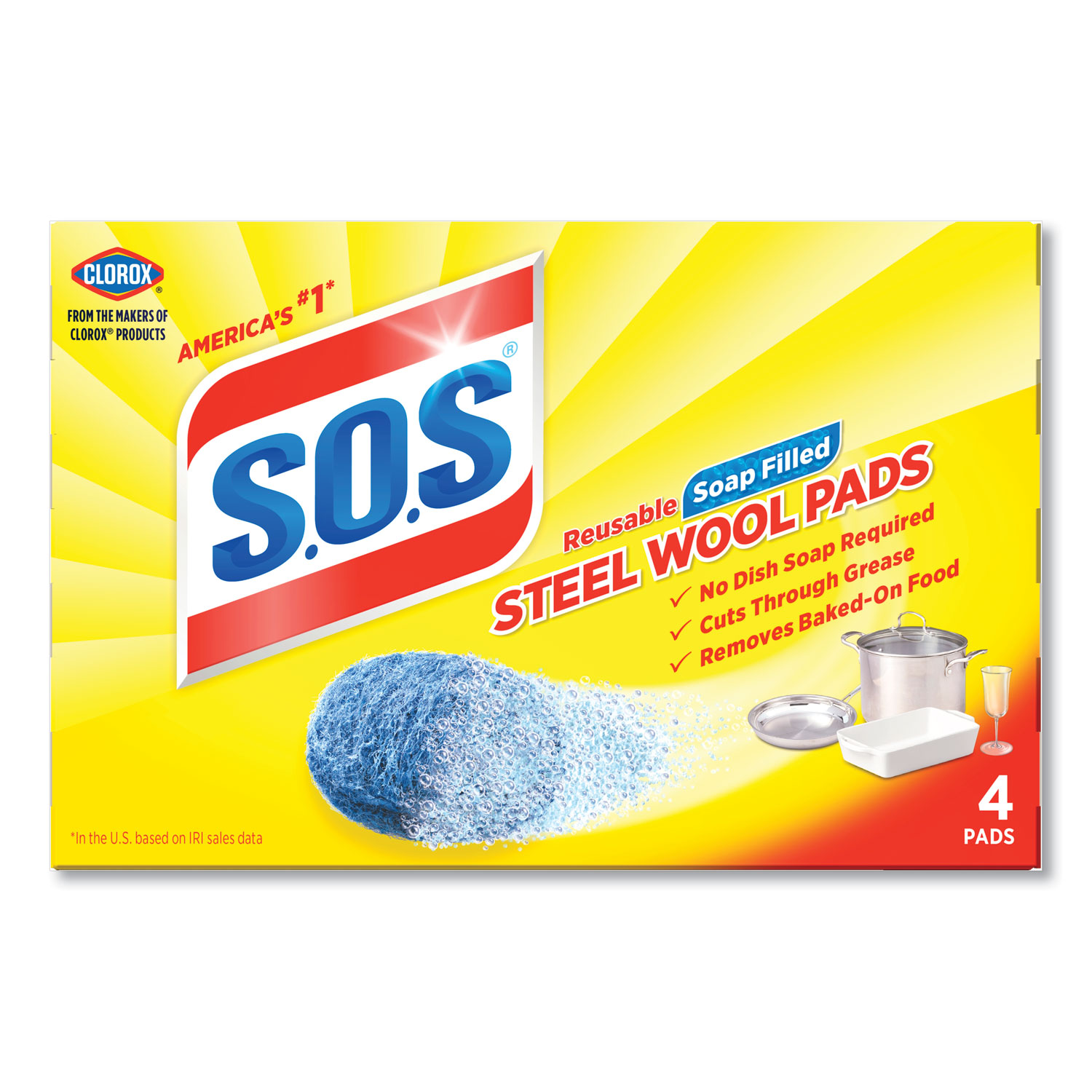 S.O.S Steel Wool Soap Pads are tough so you don't have to be. Made with durable steel wool and saturated with long-lasting soap, these pads cut through even the toughest baked-on, greasy, grimy messes. They are perfect for cleaning ovens, broilers, cookie sheets and pots and pans. These reusable steel wool soap pads are great outside the kitchen, too. From scrubbing stoves and shower doors to cleaning grills and golf clubs, S.O.S Steel Wool Soap Pads quickly removes stubborn grease, rust and stains inside and outside the home or workplace. The soap contains rust inhibitors, preservatives, biodegradable soaps and detergents, a pH buffer, fragrance and color. From Clorox Commercial Solutions, these steel wool soap pads are ideal for use in restaurants, cafeterias, hotels, break rooms and other commercial facilities. Cleaning is quick and easy with S.O.S. Scouring Pads/Sticks Type: Pad; Material(s): Steel Wool; Color(s): Steel.