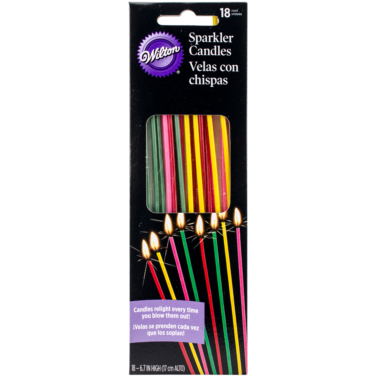 WILTON-Trick Sparkler Candles. Add a little fun to any occasion with Trick Sparkler Candles! Blow them out and they relight! Candles will sparkle intermittently. This package contains eighteen 6-1/2 inch candles in assorted colors. Colors may vary by package. Imported.