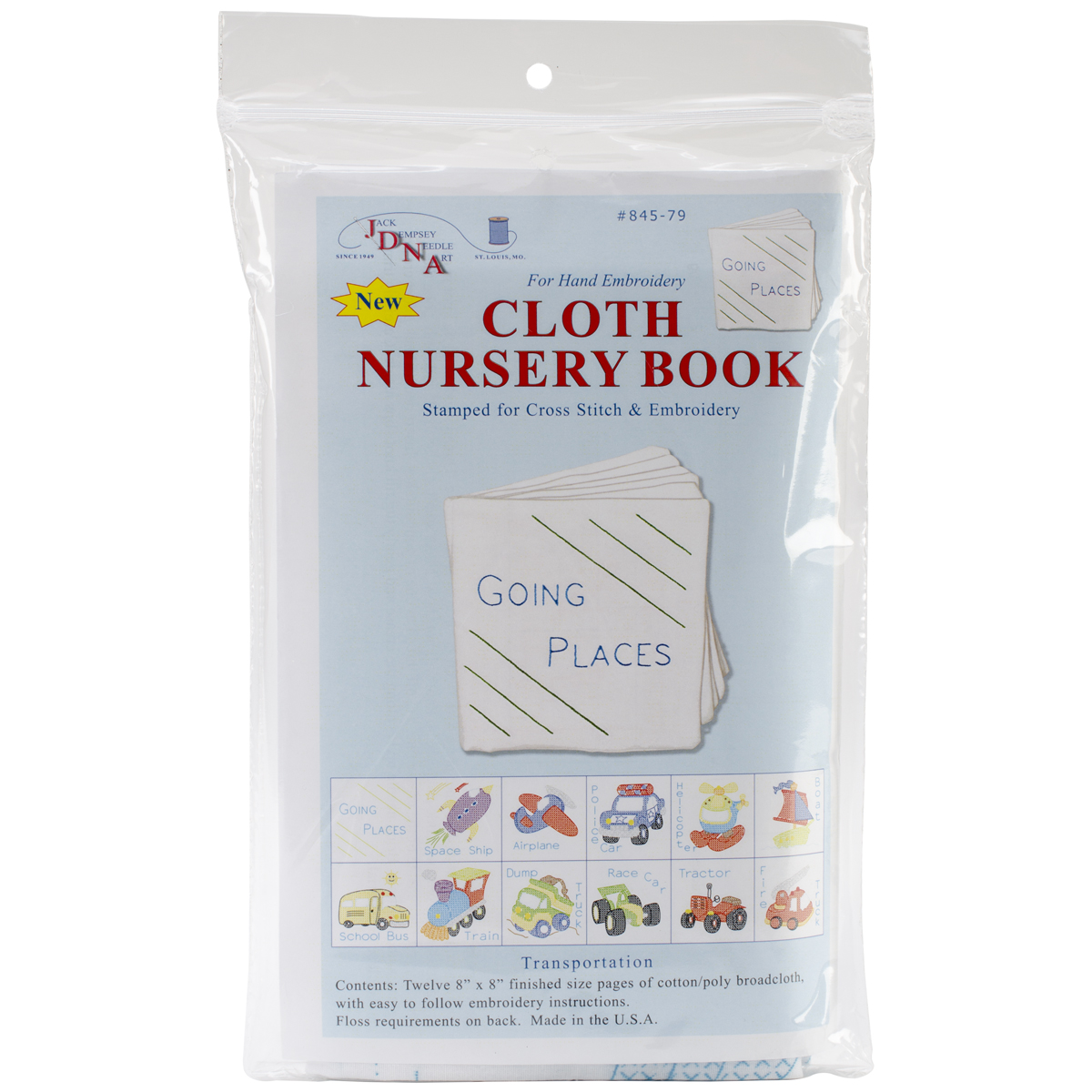 JACK DEMPSEY-Stamped Cloth Nursery Books. Create a wonderful nursery book using this great kit. The stitching design has been stamped using ink that washes away with any liquid and the fabric is a cotton/poly blend broadcloth. This package contains twelve 8x8 inch pages, instructions for completion and care and a complete list of DMC floss requirements. Hoop, thread, needle, batting and floss all sold separately. Design: Transportation. Made in USA.