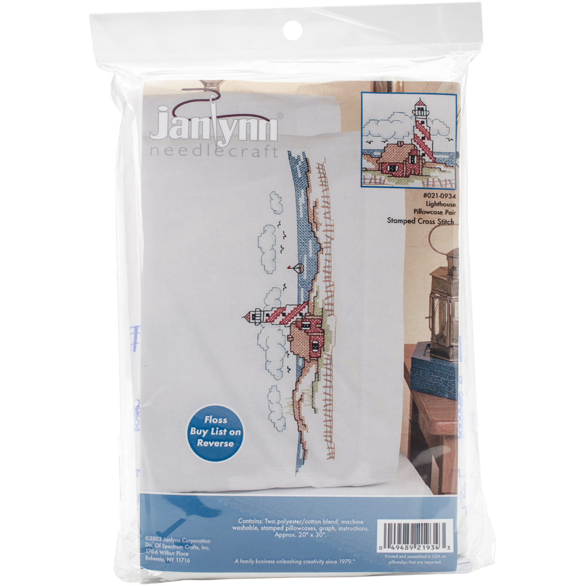 JANLYNN-Stamped Cross Stitch Kit. This kit is for talented needle arts designers ready to adorn your home with a beautiful creation. This kit contains two standard sized (20x30in) poly/cotton pillowcases pre-stamped in wash-away ink, detailed materials list, graph and instructions. Design: Lighthouse. Made in USA.