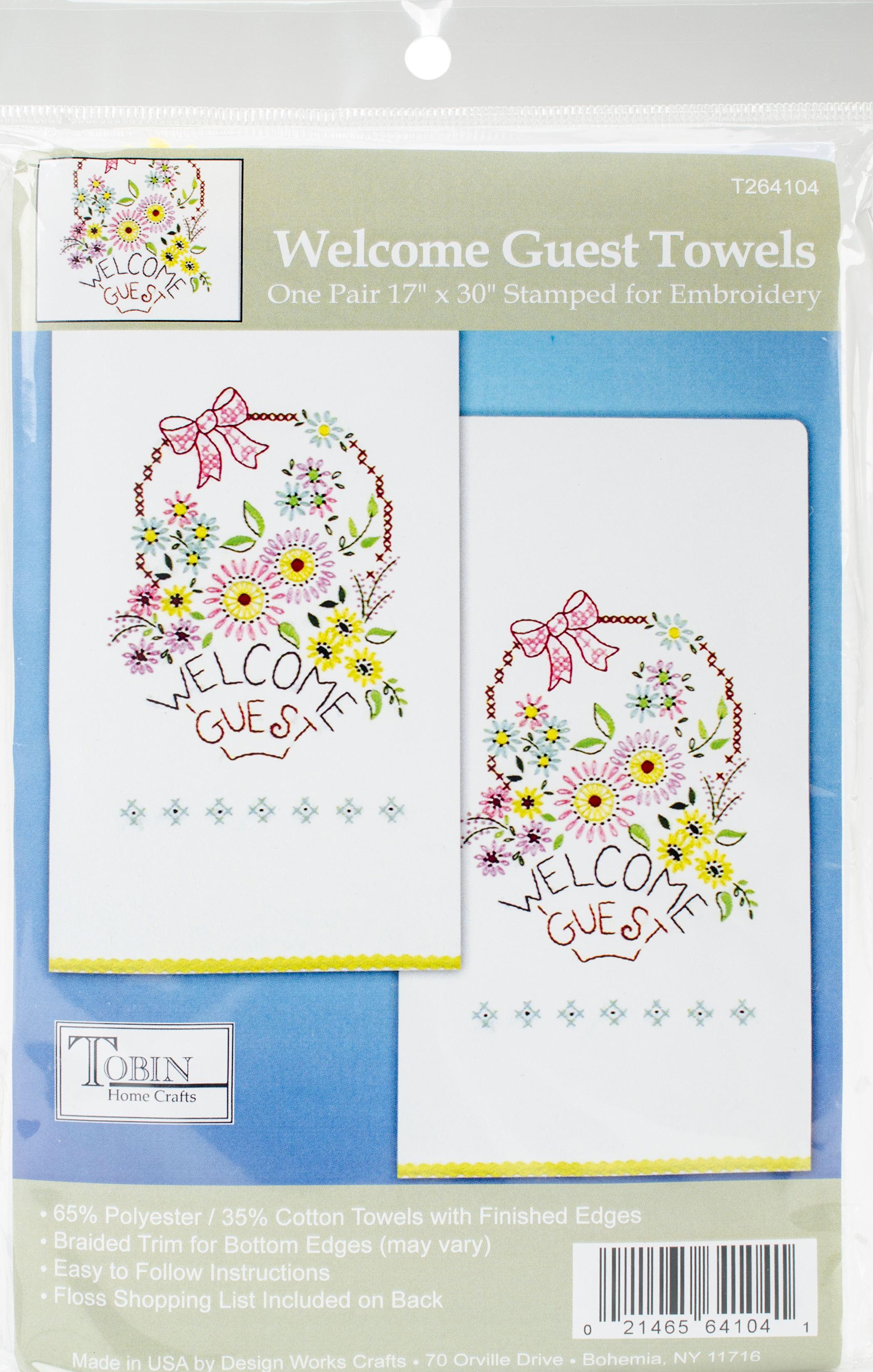 Hand embroider these adorable kitten towels! They would look great in your kitchen or would make a great gift. This package contains two 17x30 inch stamped kitchen towels and instructions. Towels are 65% polyester and 35% cotton. Design: Welcome Guest. Made in USA.