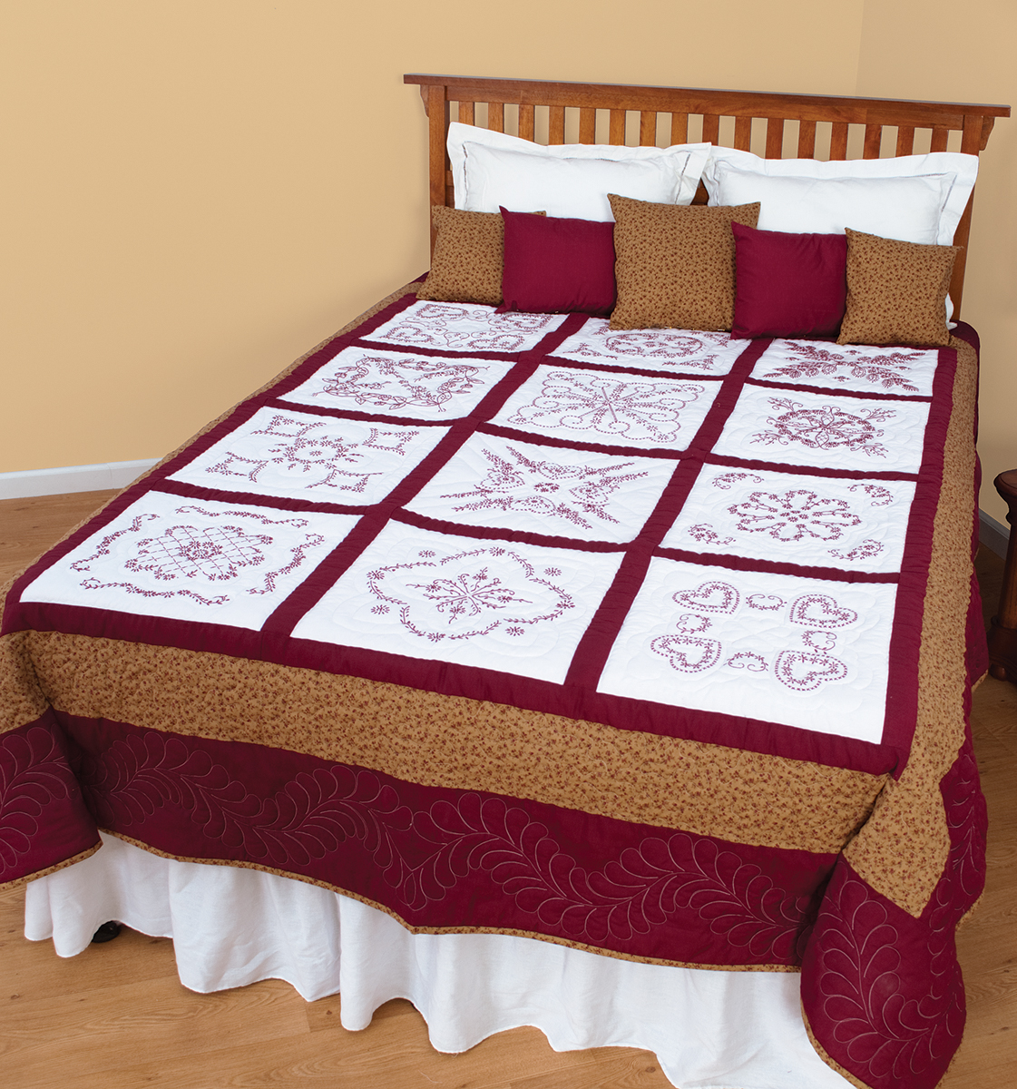 JACK DEMPSEY-Stamped White Sampler Quilt Blocks. Create a gorgeous stitched and embroidered sampler quilt! This package contains twelve 18x18 inch cotton/poly broadcloth quilt blocks and instructions. Needle, thread, floss, backing, batting, and hoop not included. Design: Vintage Revival. Made in USA.