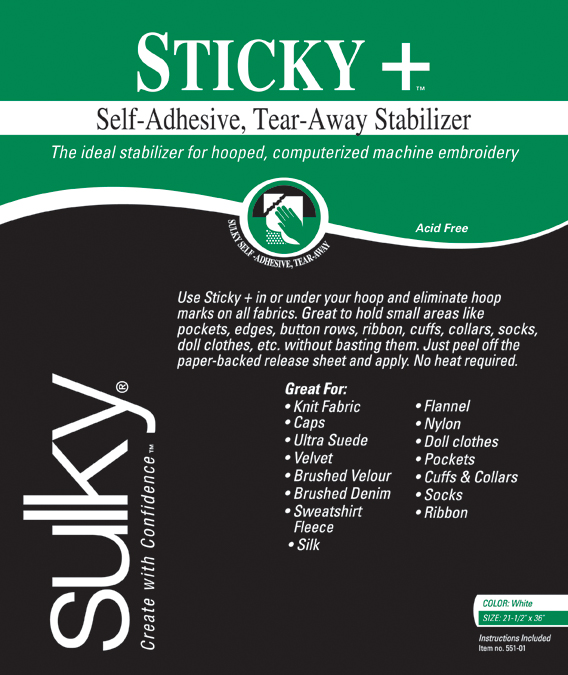 SULKY: Sticky Self-Adhesive Tear-Away Stabilizer. This is a unique non-woven stabilizer designed especially for machine embroidery with a hoop, paper-back, self-adhesive, non-woven stabilizer. This package contains one 22-1/2x36 inch sheet of stabilizer. Imported.