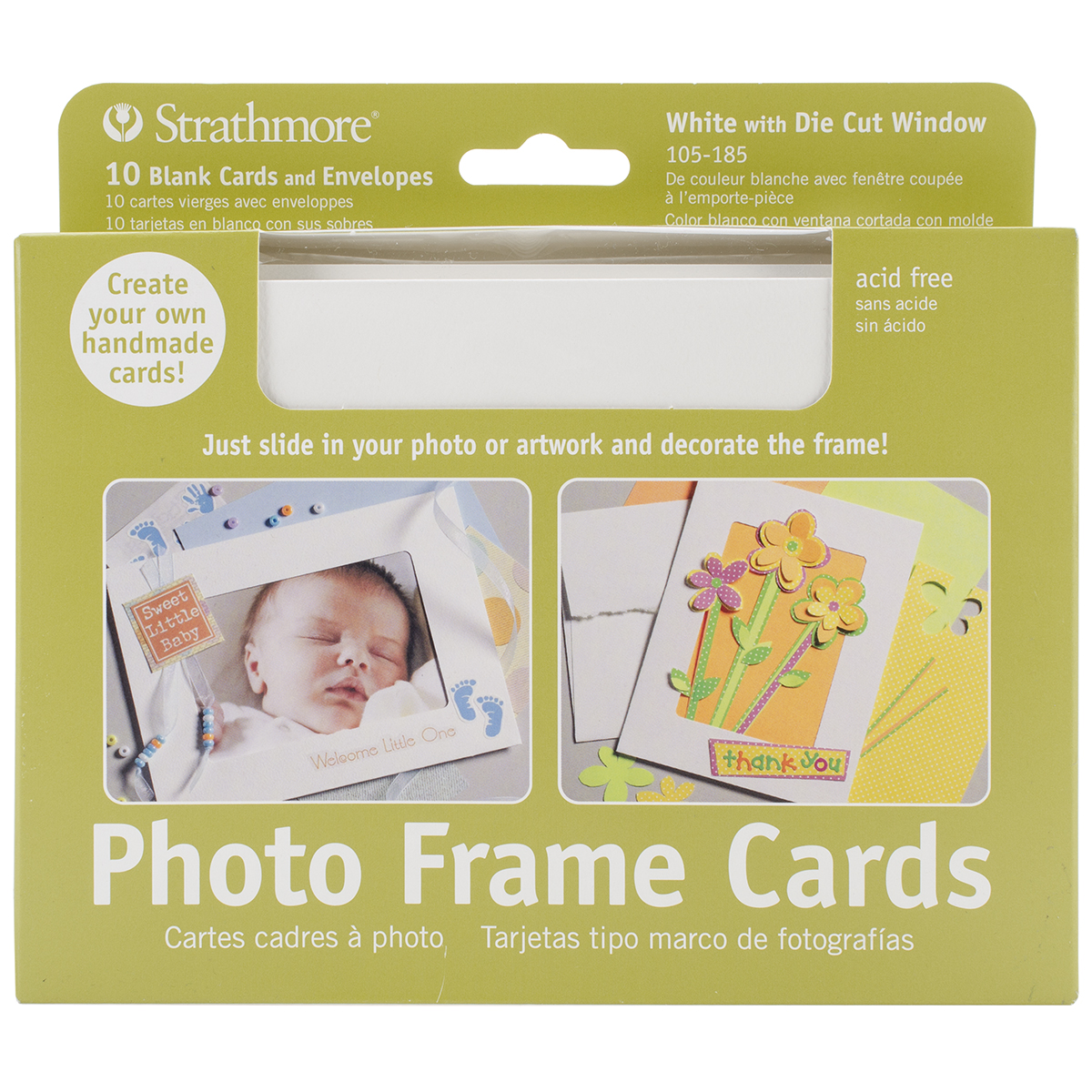 Strathmore-Cards & Envelopes: White Photo Frame. The distinctive texture and quality of Strathmore creative cards are the perfect way to personalize your correspondence! Ideal for colored pencils, rubber stamps, die cuts, collage and more! Create unique, hand decorated cards for special occasions or everyday use. This package contains ten 5x7 inch blank cards with die-cut windows and ten envelopes. Acid free. Made in USA.