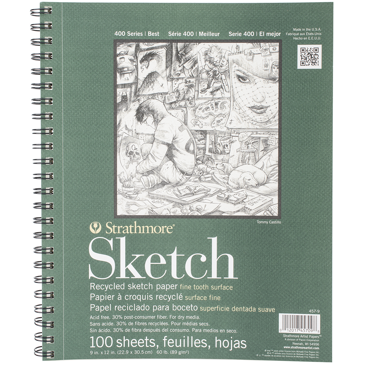 STRATHMORE-Recycled Spiral Sketch Book. A general purpose, medium weight sketch paper intended for experimentation or perfecting techniques. This package contains one 12x9 inch side spiral-bound sketch book with 100 sheets of 60lb acid free, lightly textured paper. Acid free and made of 30% post-consumer waste fiber. Made in USA.