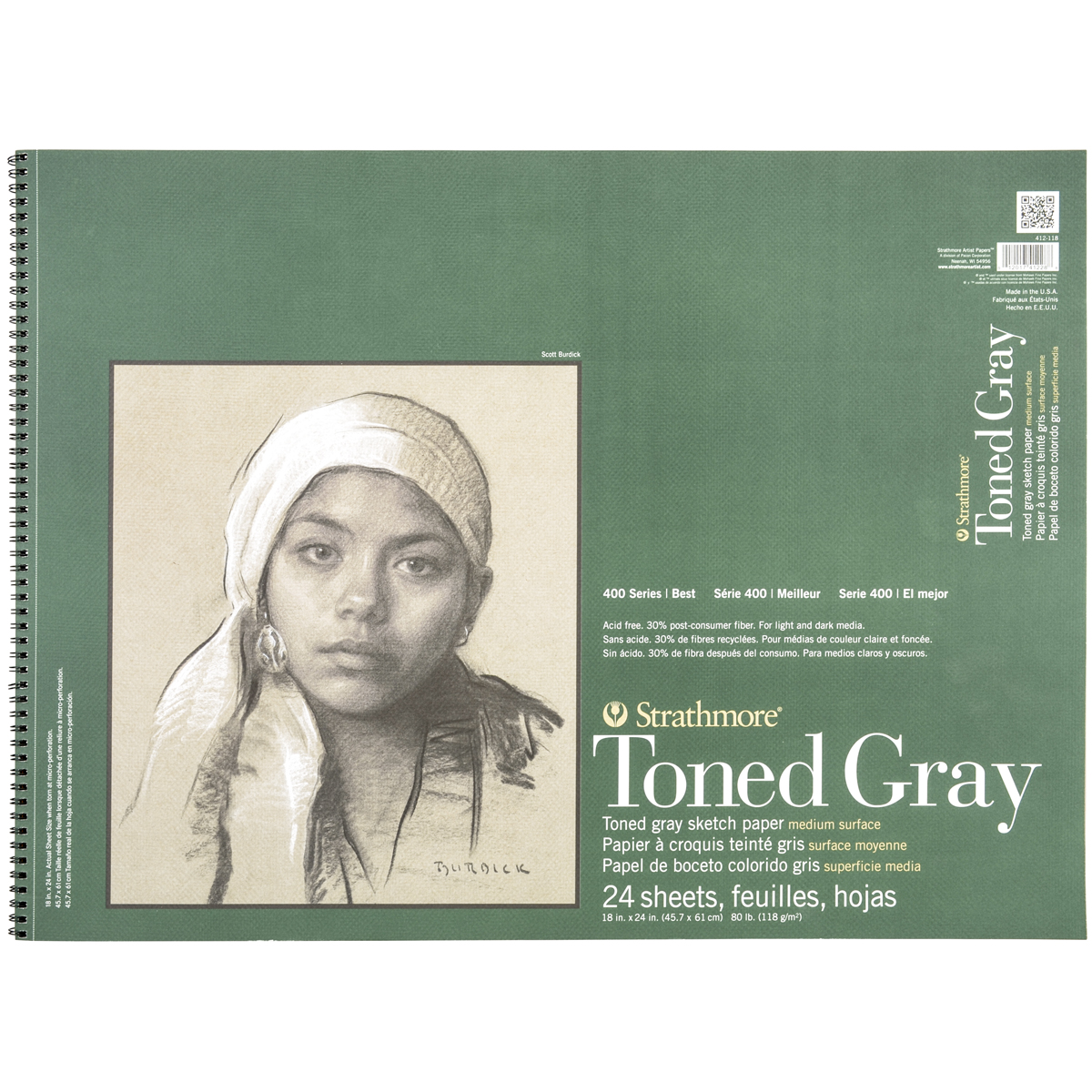 Strathmore-Sketch Paper Pad: Toned Gray. A gray toned sketch paper with a medium surface ideal for mastering light and dark media techniques. This package contains one 18x24 inch sketch pad with twenty-four sheets of 80lb acid free sketch papers. Made in USA.