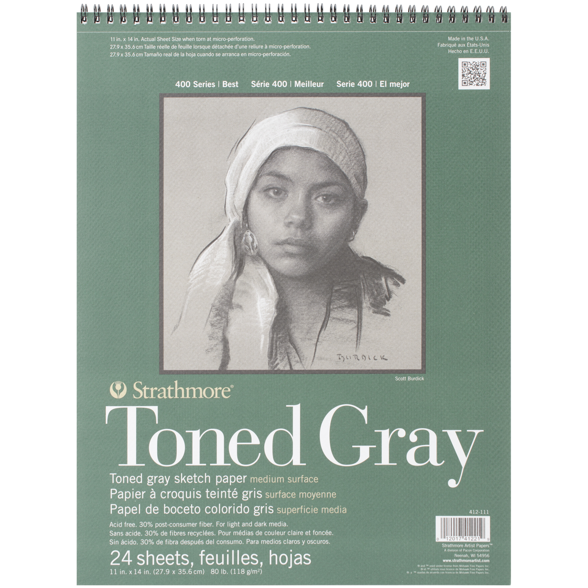 Strathmore-Toned Sketch Paper Pad. A gray toned sketch paper with a medium surface ideal for mastering light and dark media techniques. This package contains one 14x11 inch sketch pad with twenty-four sheets of 80lb acid free sketch papers. Made in USA.