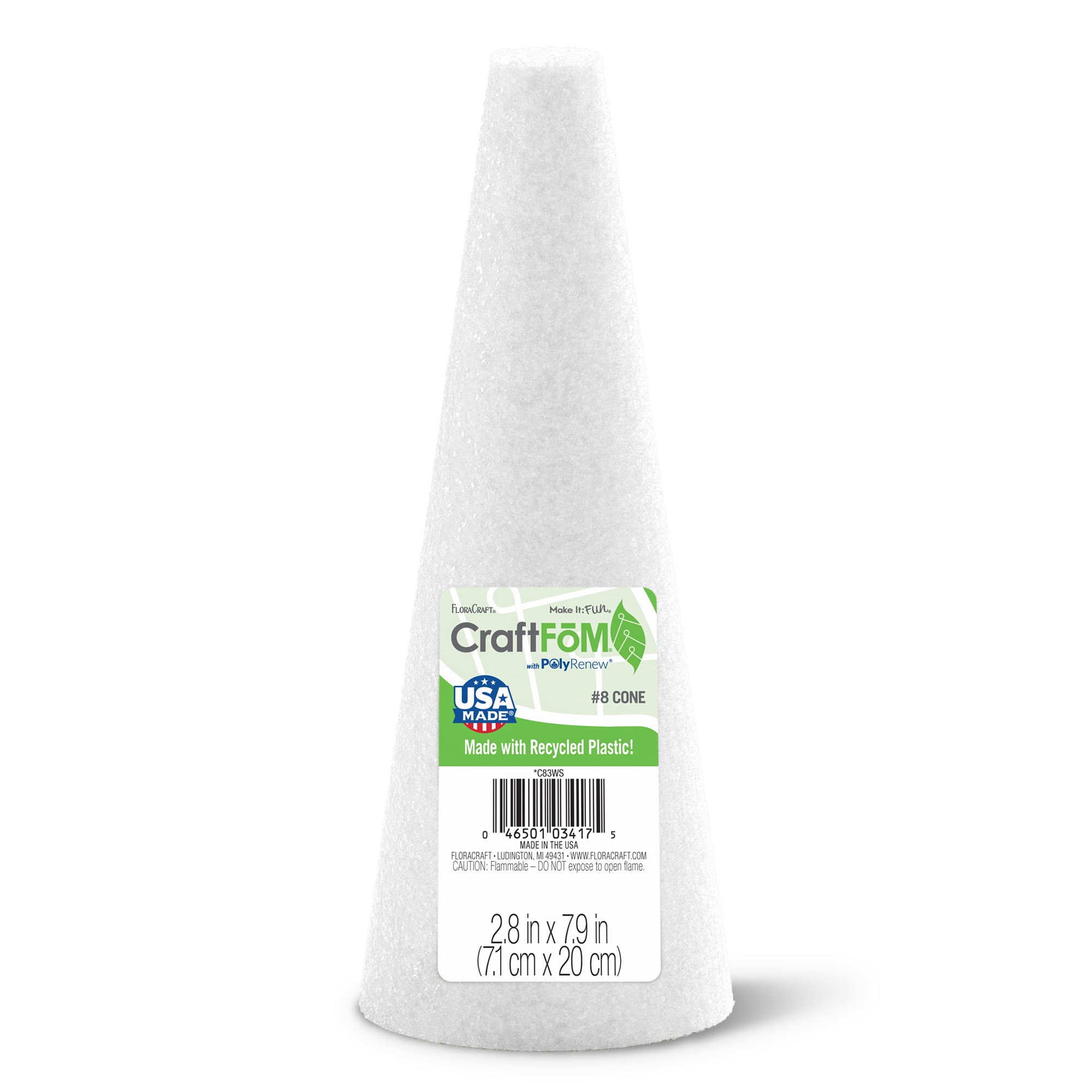 FLORACRAFT-Recyclable Styrofoam. This is the perfect base for all floral and craft projects. It is available in a variety of durable pre-cut shapes and sizes to meet any design need. This package contains one 8x3in white cone. Made in USA.
