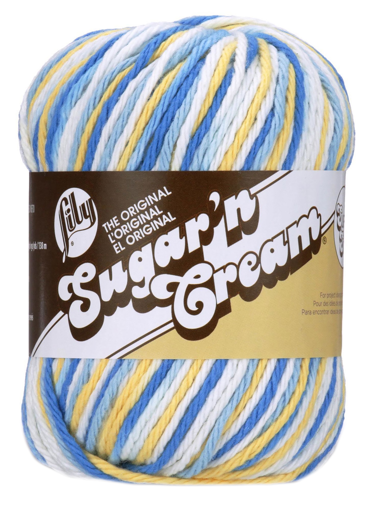 LILY-Sugar'n Cream Super Size. Natural, soft, and absorbent cotton. Worsted weight: the most popular weight. Ideal for knit & crochet and craft projects. In a large size. Weight category: 4, 100% cotton, 3oz/85g, 150yd/138m. Gauge: 20st x 26r = 4in/10cm on size US7/4.5mm knitting needles. Recommended crochet hook size H8/5mm. Care: machine wash, tumble dry, do not bleach, do not iron, do not dry clean. Made in Canada.