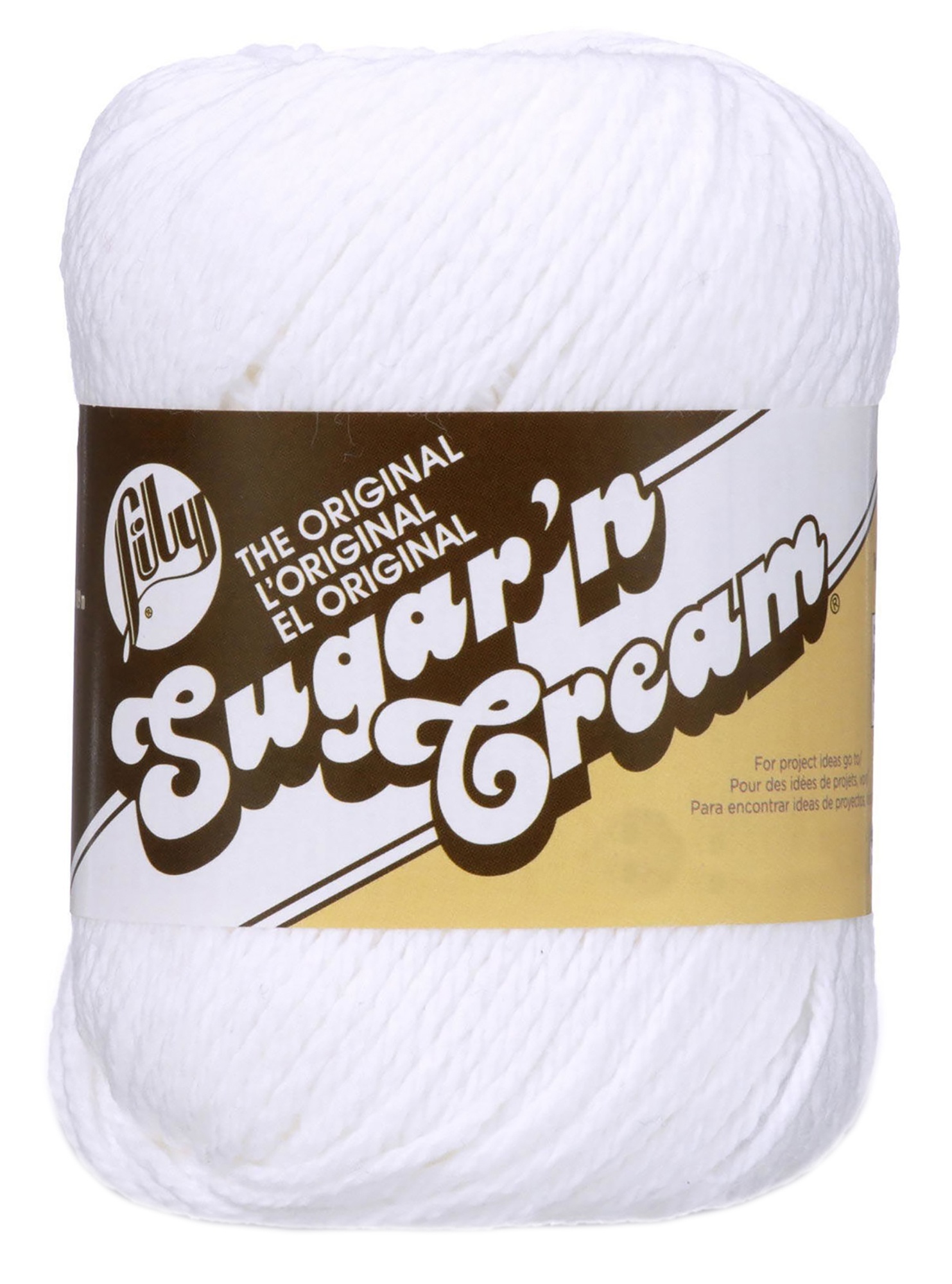 LILY-Sugar'N Cream Yarn: Solids. Natural, soft and absorbent cotton is ideal for knitting and crocheting kitchen and bath projects. Weight Category: 4, 100% cotton. 2-1/2oz/71g, 120yd/109.73m. Gauge: Knit: 20st x 26r = 4in/10cm on size 7/4.5mm needles, Crochet: 20st x 26r = 4in/10cm on size 7/4.5mm hook. Machine wash, tumble dry, do not bleach, do not iron, do not dry clean. Made in USA.