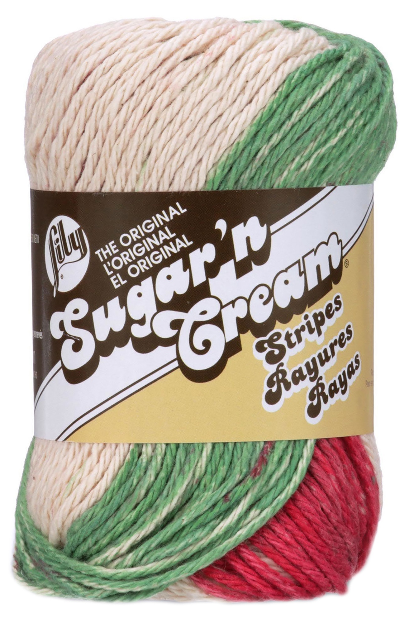 LILY-Sugar'n Cream Yarn: Stripes. Natural, soft and absorbent cotton is ideal for knitting and crocheting kitchen and bath projects. Weight Category: 4, 100% cotton. 2oz/56g, 95yd/86m. Gauge: Knit: 20st x 26r = 4in/10cm on size 7/4.5mm needles, Crochet: 20st x 26r = 4in/10cm on size 7/4.5mm hook. Machine wash, tumble dry, do not bleach, do not iron, do not dry clean. Made in USA.